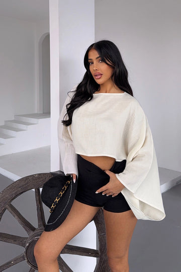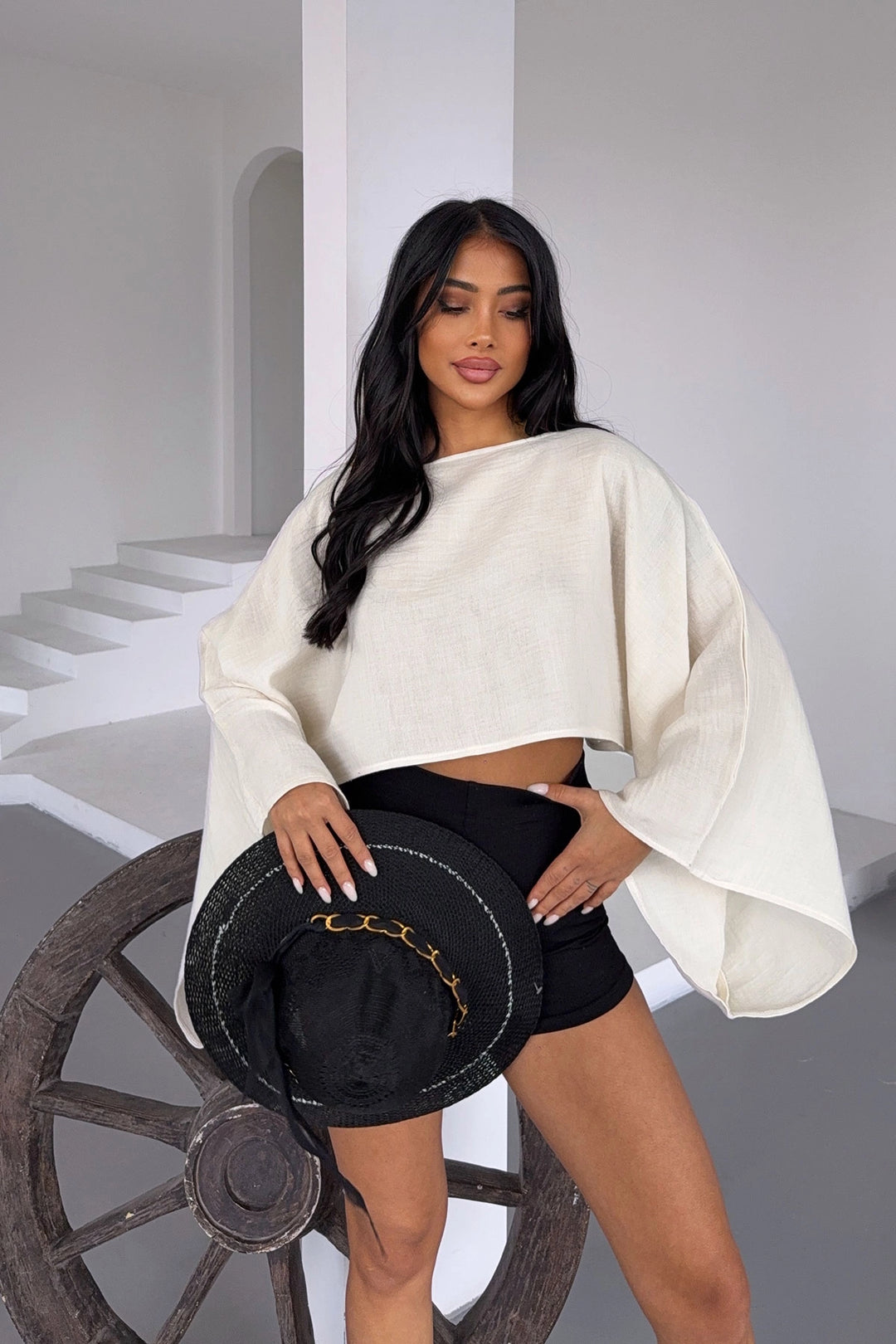 Ecru Wide Neck Batwing Sleeve Muslin Fabric Linen Blouse BCBT-251003 - Burleson