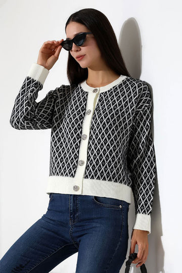 Ecru Square Patterned Buttoned Cardigan BCES-252004 - Nettetal