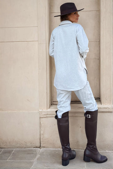 Ecru Stone Leather Trimmed Back Printed Stamp Oversized Jacket Shirt BCBSK-25700-3289 - Coventry