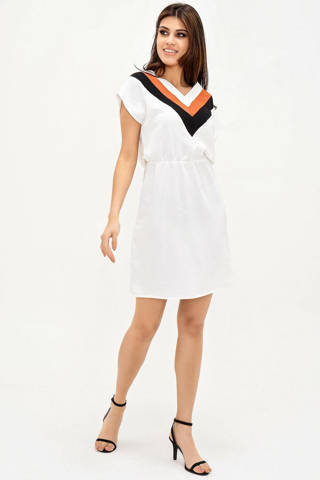 Ecru V-Neck Block Belted Dress BCBSK-25700-2855 - Komotiní