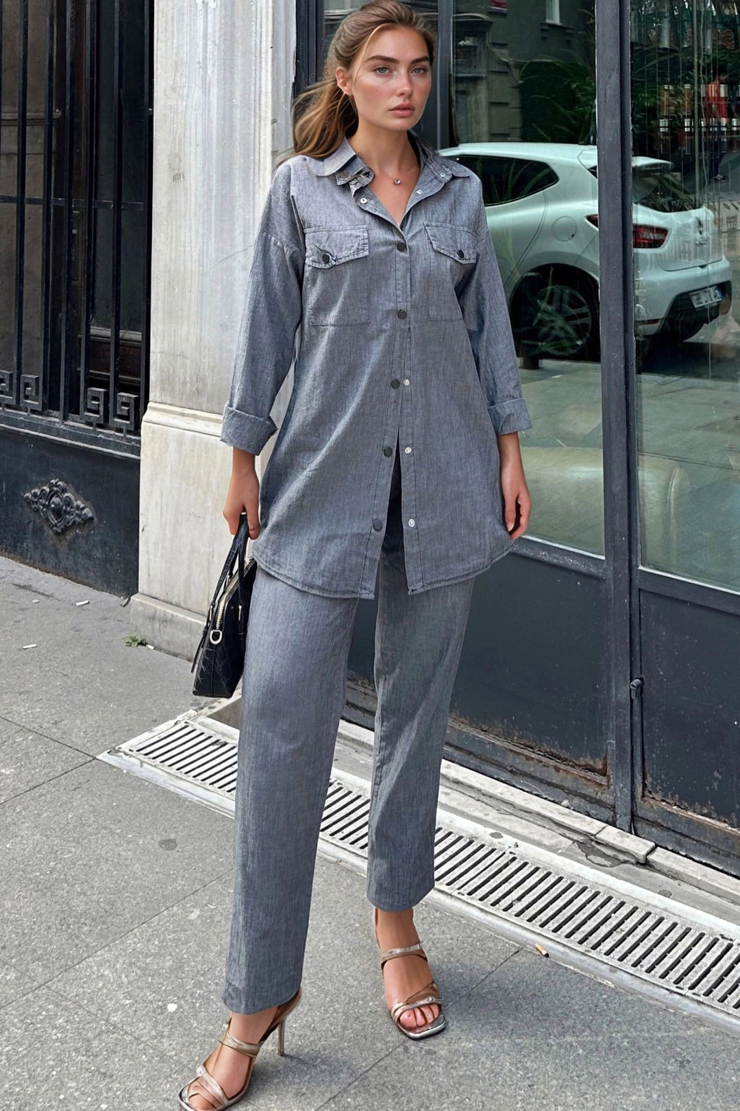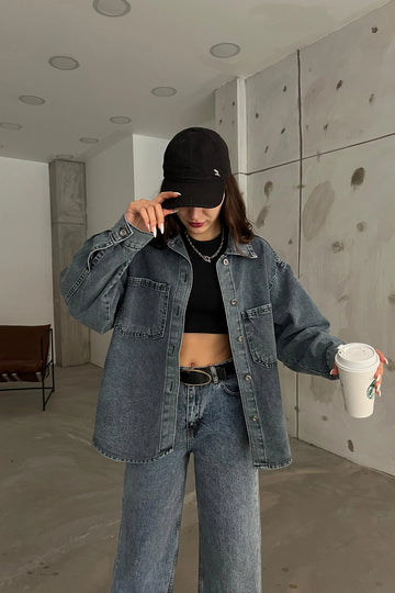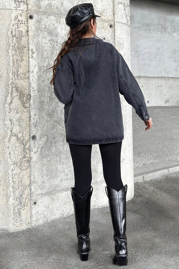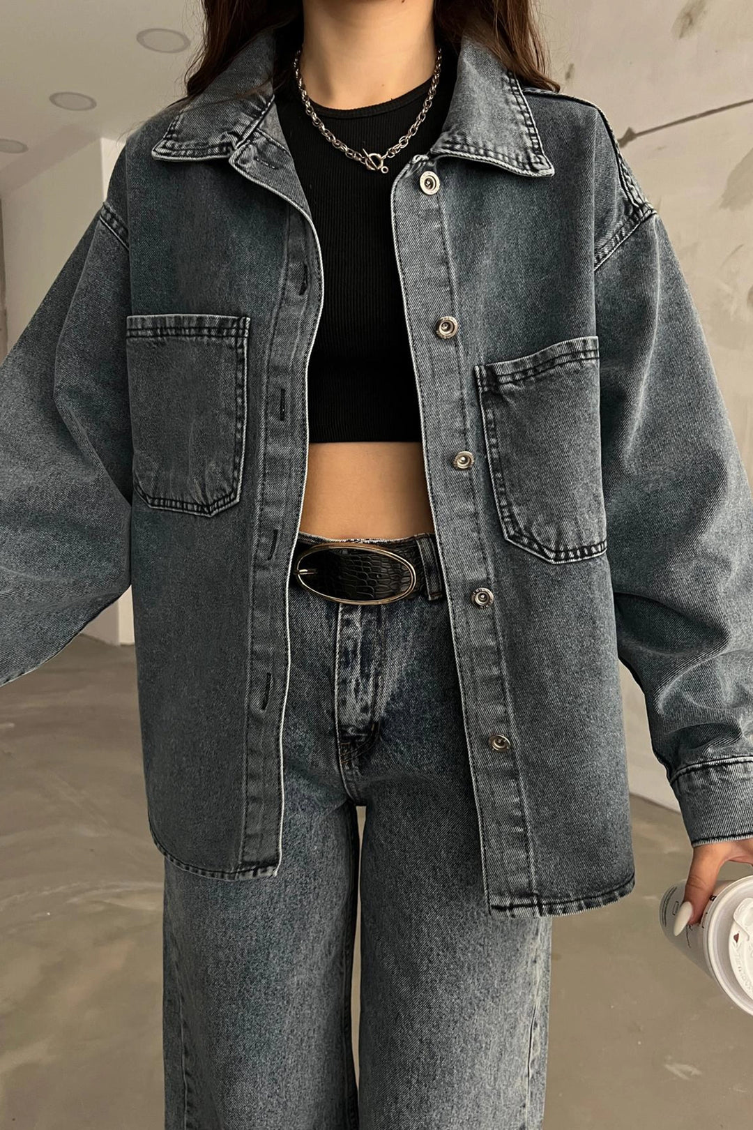 Anthracite Double Pocket Balloon Sleeve Oversized Denim Jacket BCDF-235402 - Onteniente