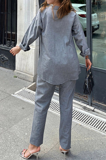 Anthracite Linen V-Neck Asymmetric Striped Loose Dress BCBSK-25700-3340 - Tortosa