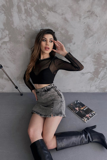 Anthracite Slit Detailed Denim Shorts Skirt BCDF-243309 - Mission
