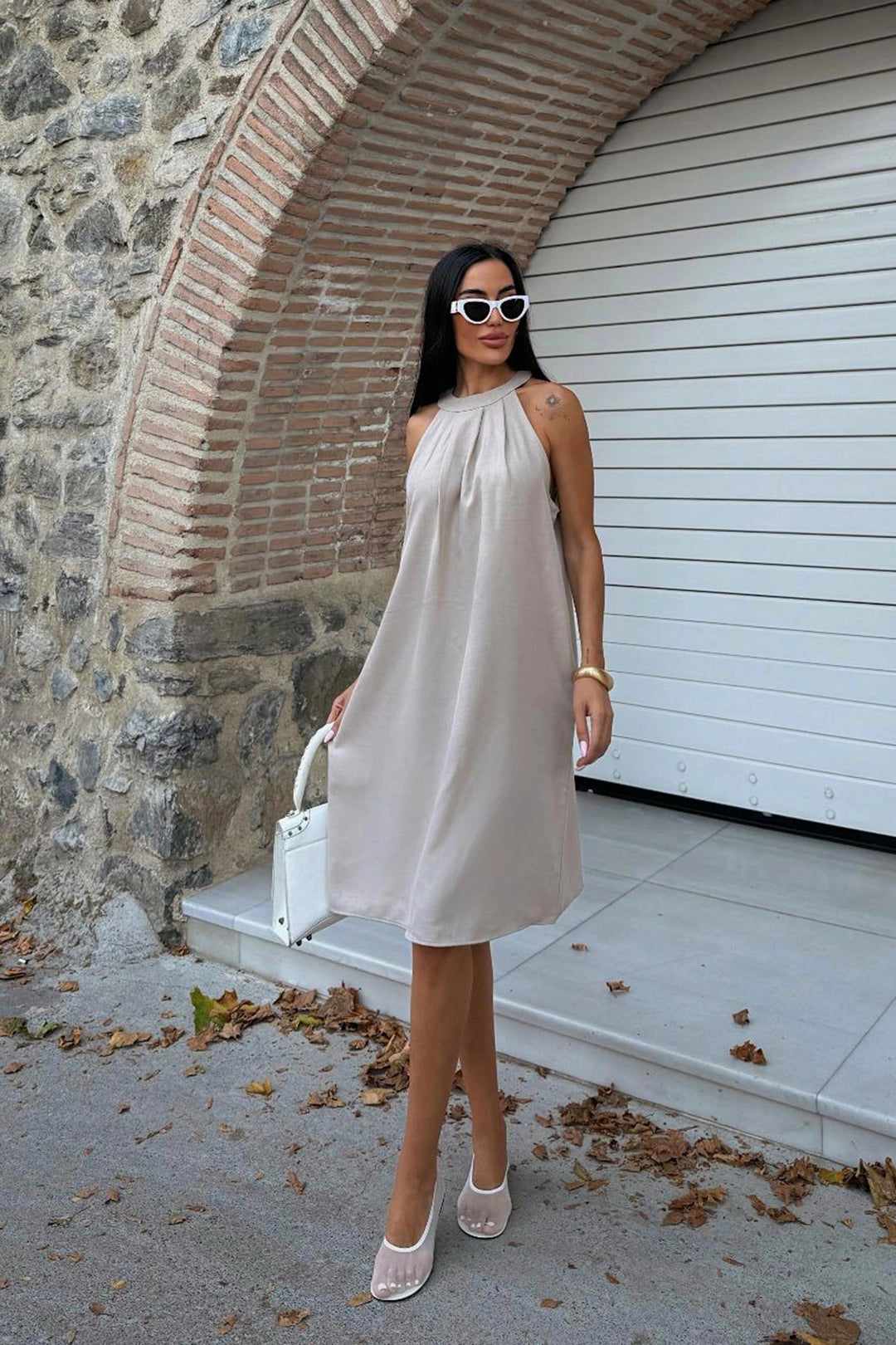 Beige Halter Neck Self-Belted Long Dress BCBSK-25700-2896 - Chieri