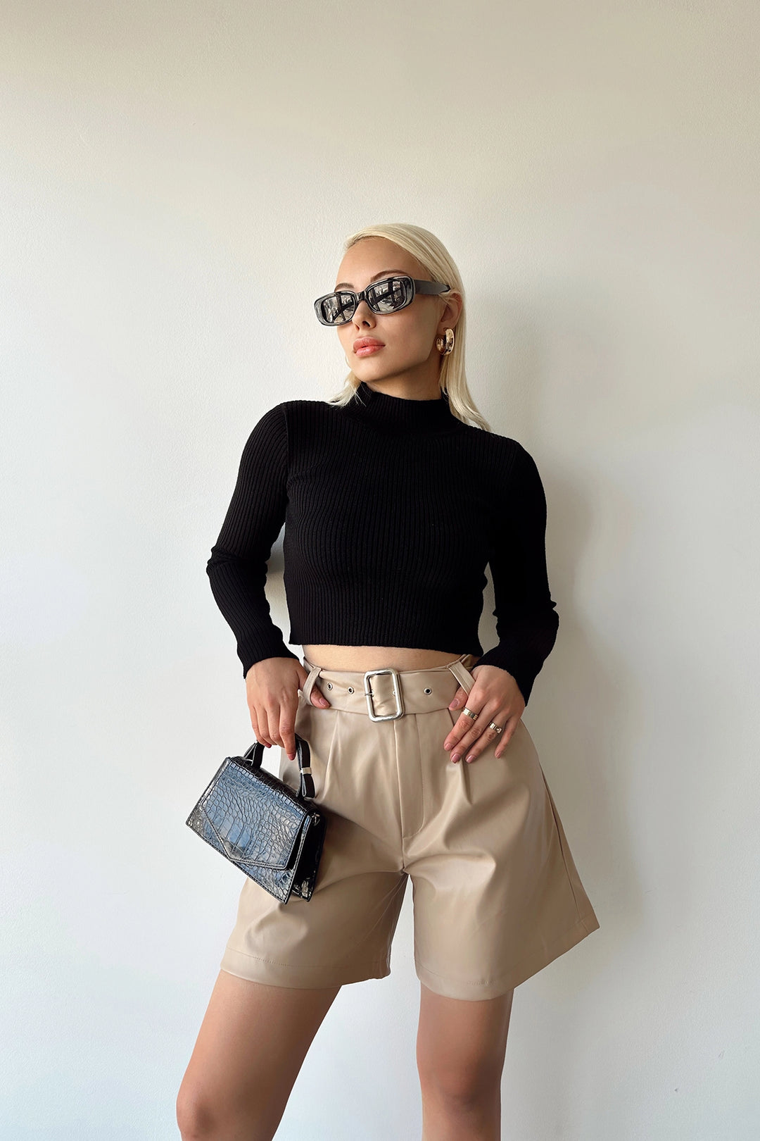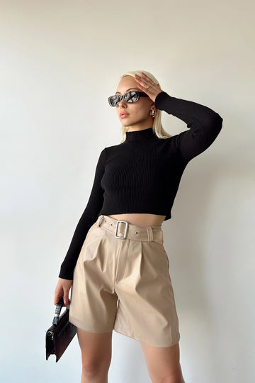 Beige Faux Leather Belted Boyfriend Shorts BCDF-233500 - Wels