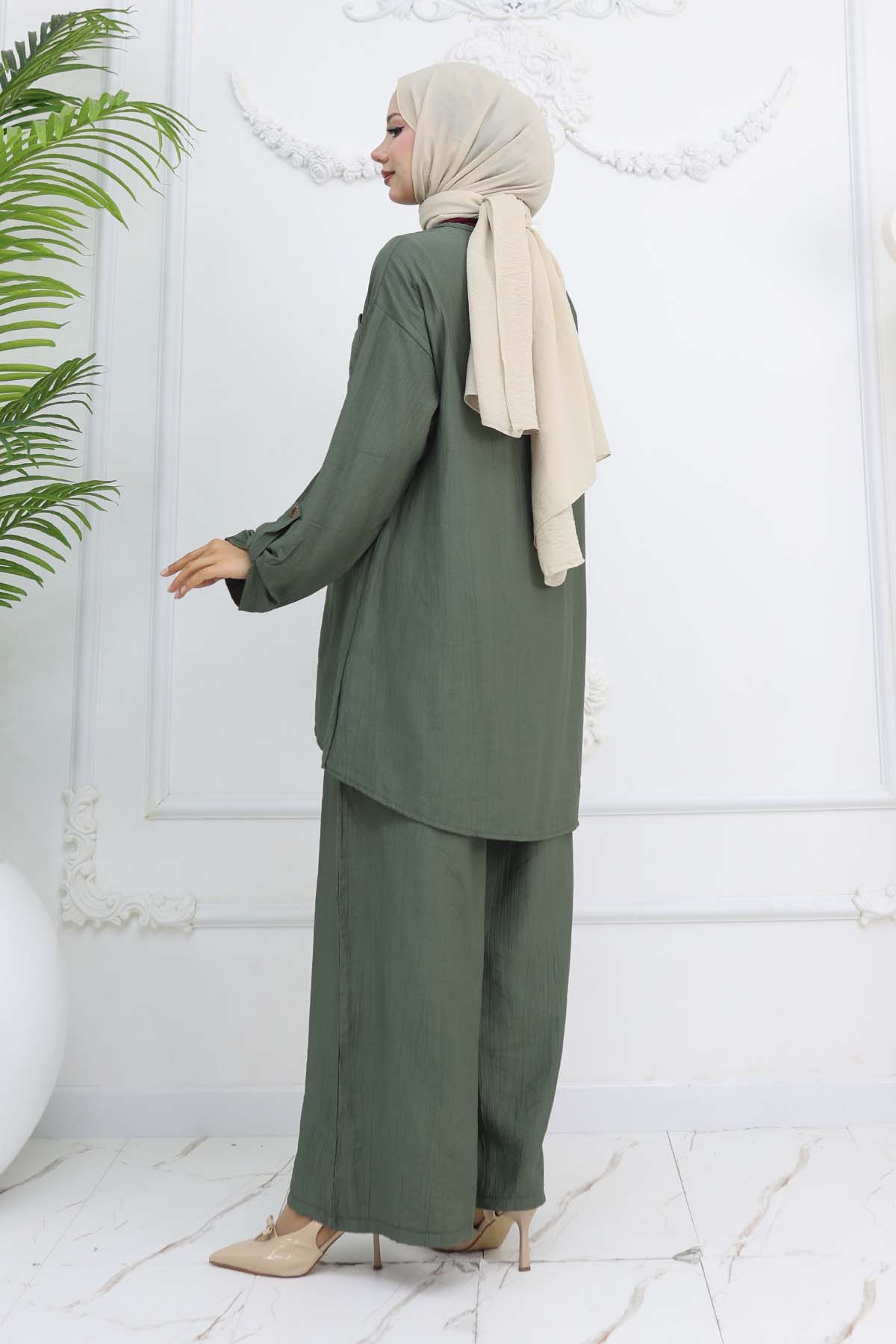 Product Feature: The product is in normal size, you can choose your regular size. Product Information: Top Length: 87 cm Chest: 110 cm Pant Length: 103 cm Waist: 70 cm Hips: 120 cm. Fabric type: %50 Viscose %45 Polyester %5 Lycra. Model Measurements: Height: 166 cm, Chest: 90 cm, Waist: 71 cm, Hips: 91 cm. The product on the model is size M/38. There may be a slight color difference due to concept shootings in the product color.