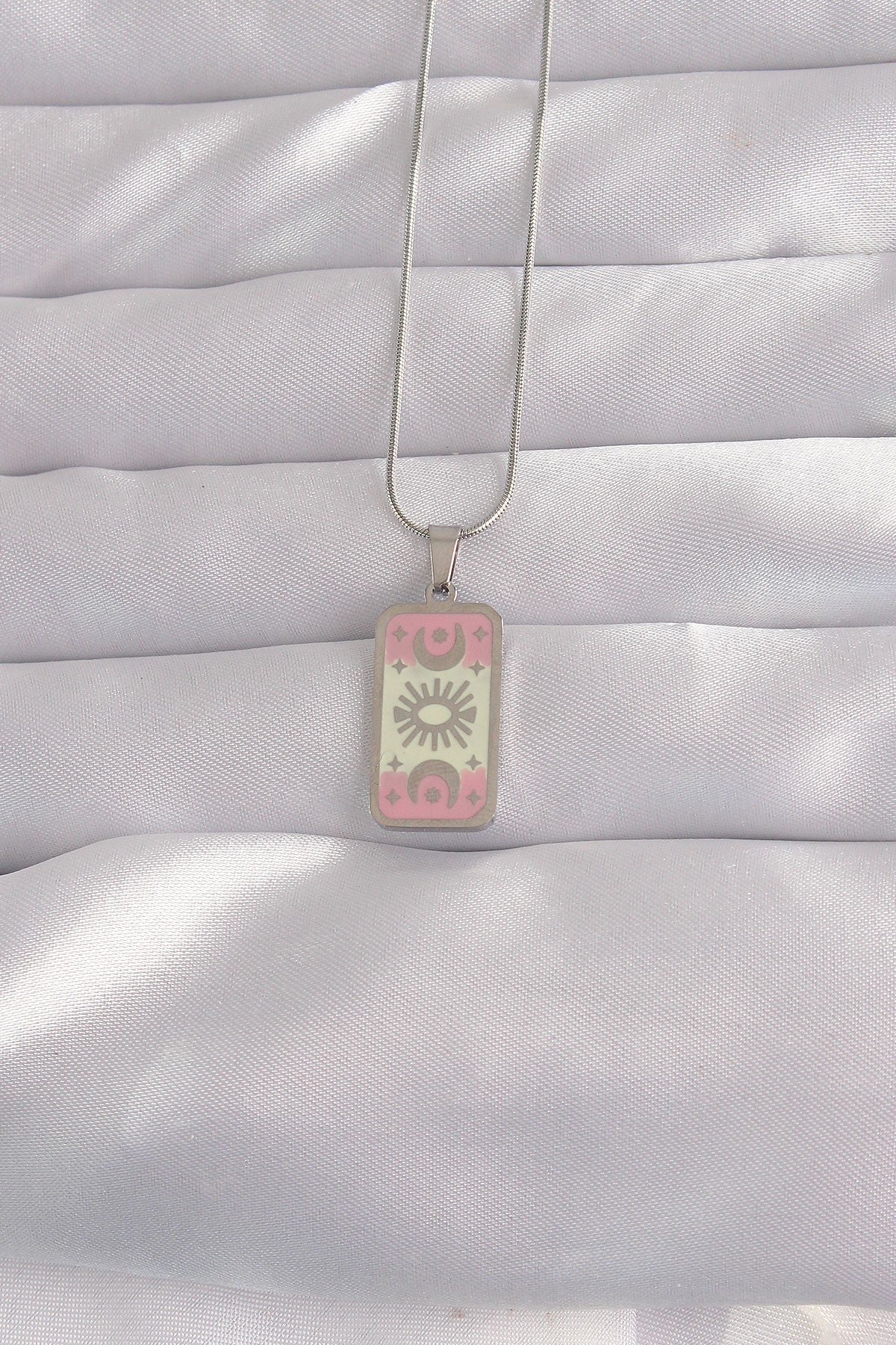 EBJ 316L Stainless Steel Silver Color Pink Enamel Moon Figure Tarot Necklace - Perpignan