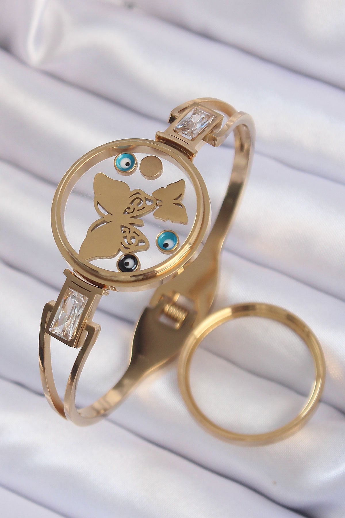 EBJ 316L Steel Gold Color Inside Butterfly and Evil Eye Figure Openable Bracelet Jar - Bentonville