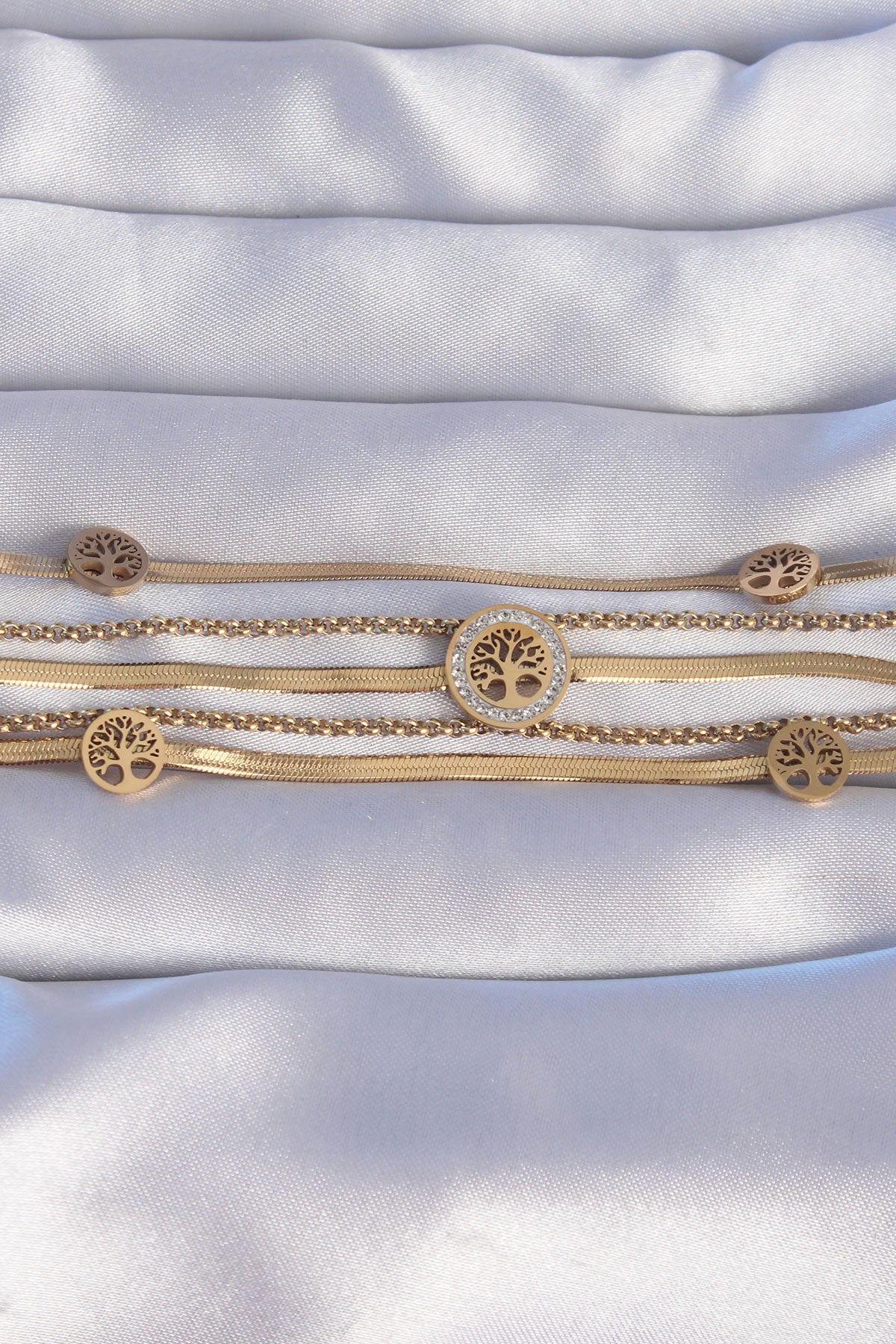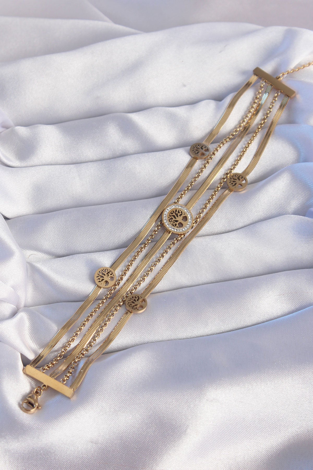 EBJ 316L Steel Gold Color Italian Chain Detailed Zircon Stone Life Tree Designed Multi Bracelet - Narbonne