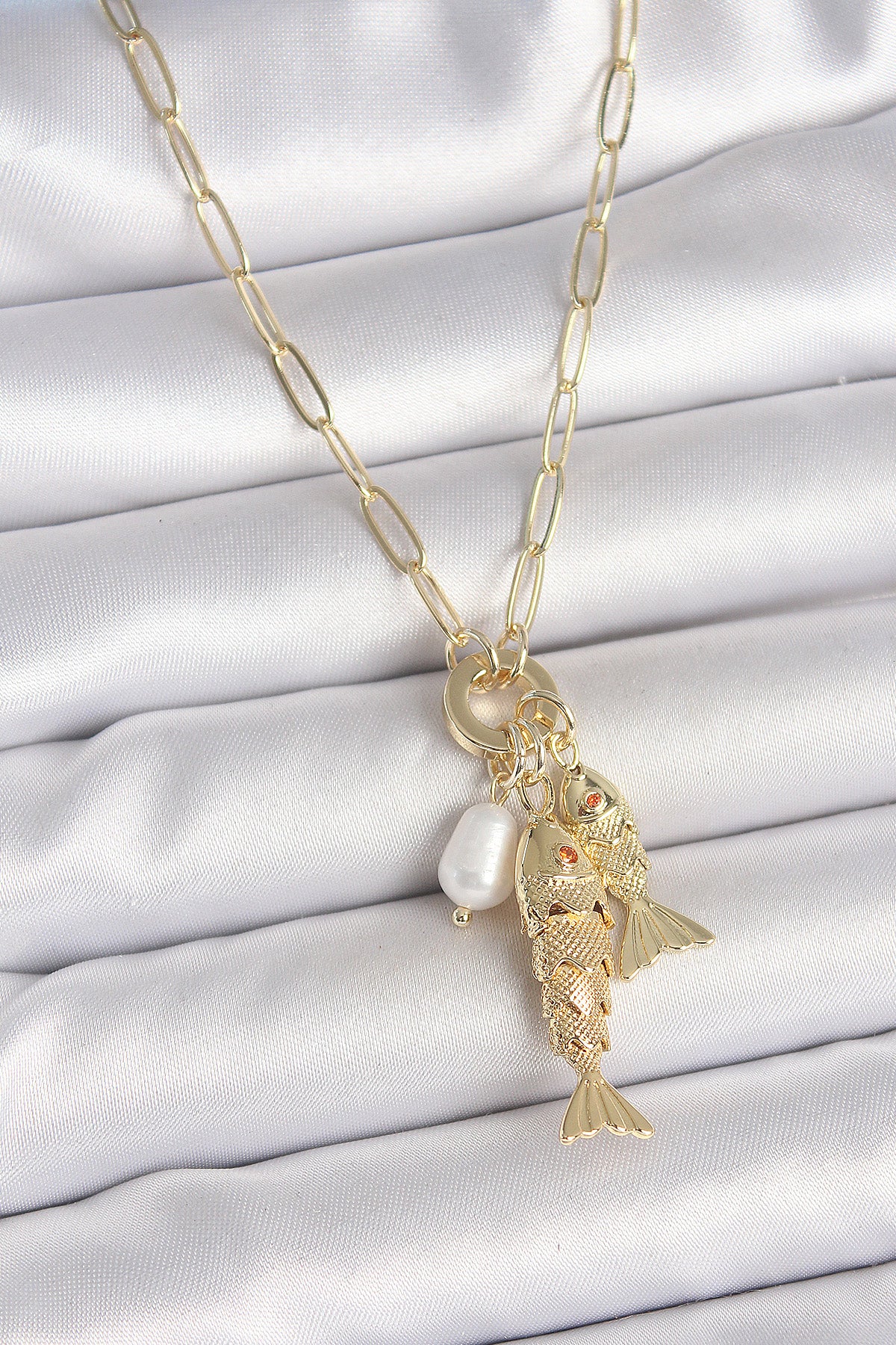 EBJ Pearl Detailed Zircon Stone Double Fish Figured Gold Color Brass Necklace - Deventer