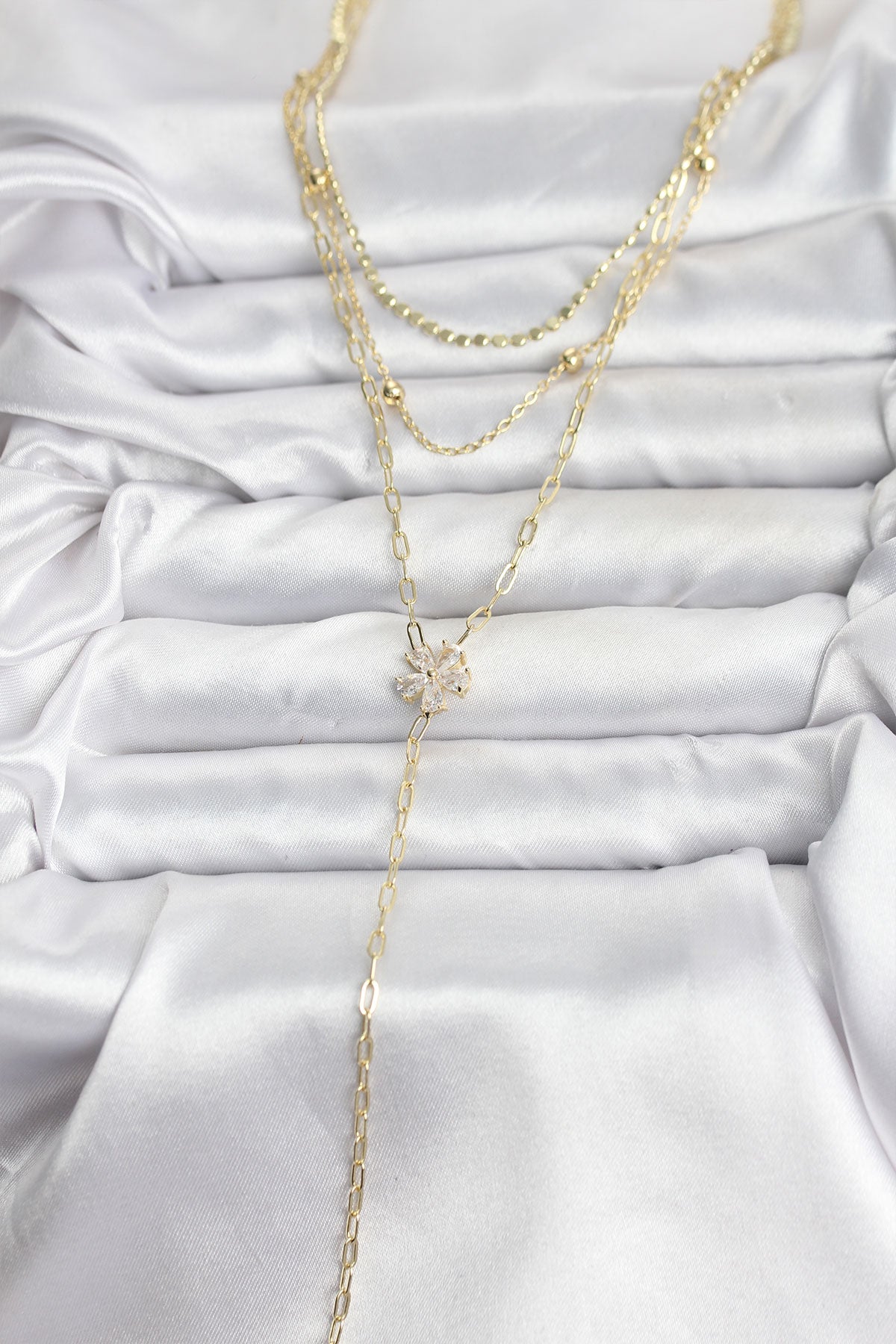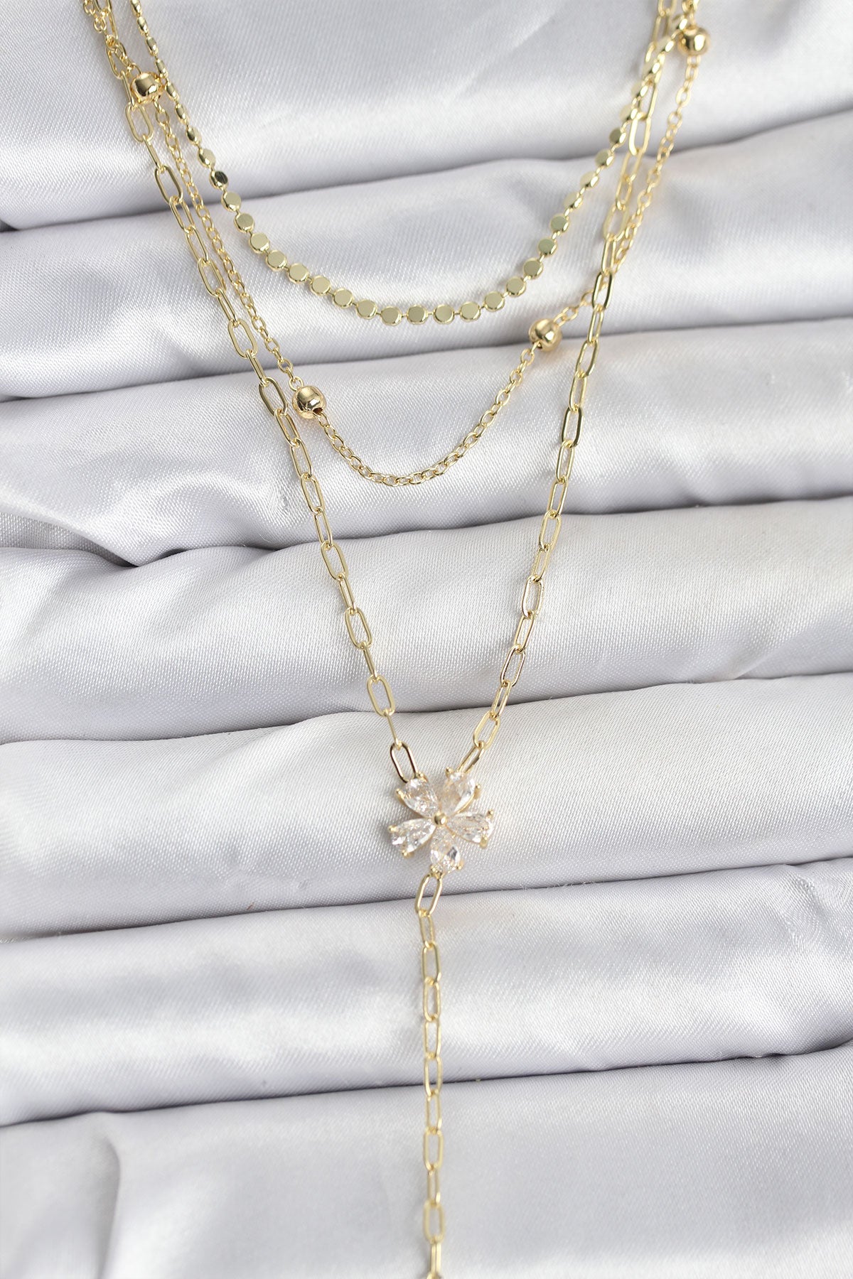 EBJ Pirinç Gold Renk Zirkon Taşlı Çiçek Model Detaylı 3'lü Kombin Y Kadın Kolye - Yenakiieve