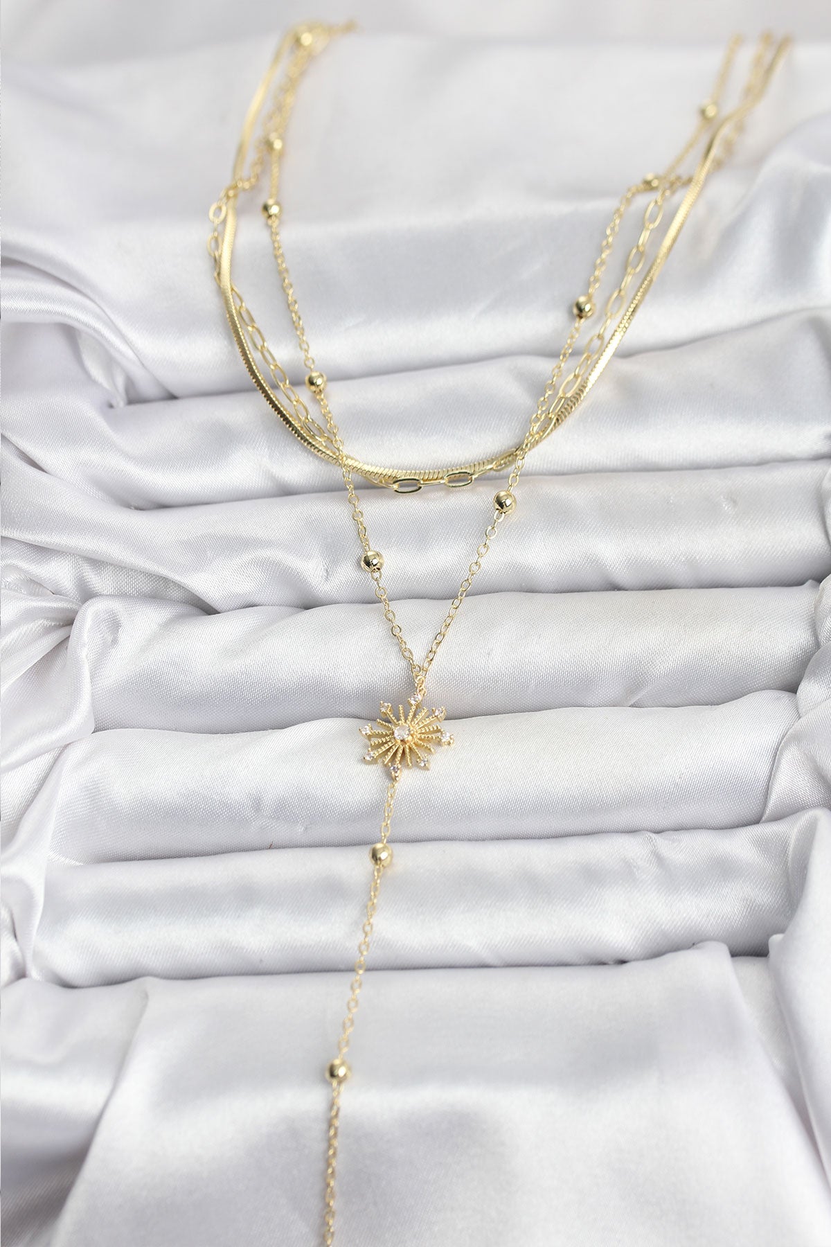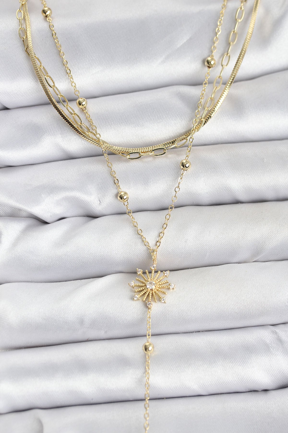 EBJ Pirinç Gold Renk Zirkon Taşlı Model Detaylı 3'lü Kombin Y Kadın Kolye - Narbonne