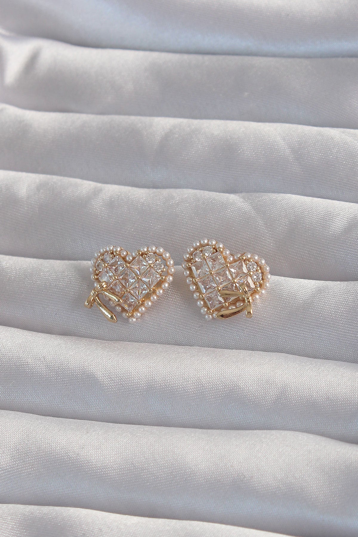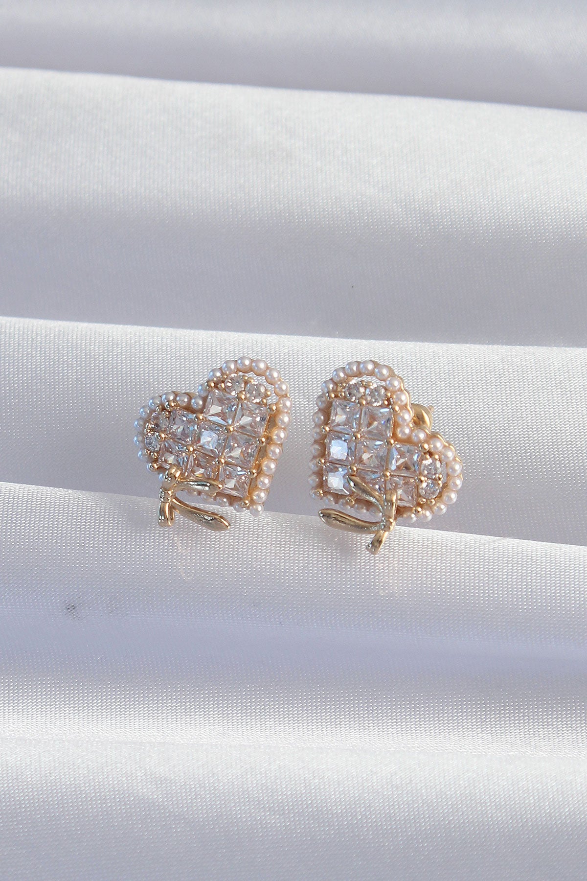 EBJ Rice Gold Color Bow Detail Pearl Zircon Stone Heart Earrings - Boca Raton
