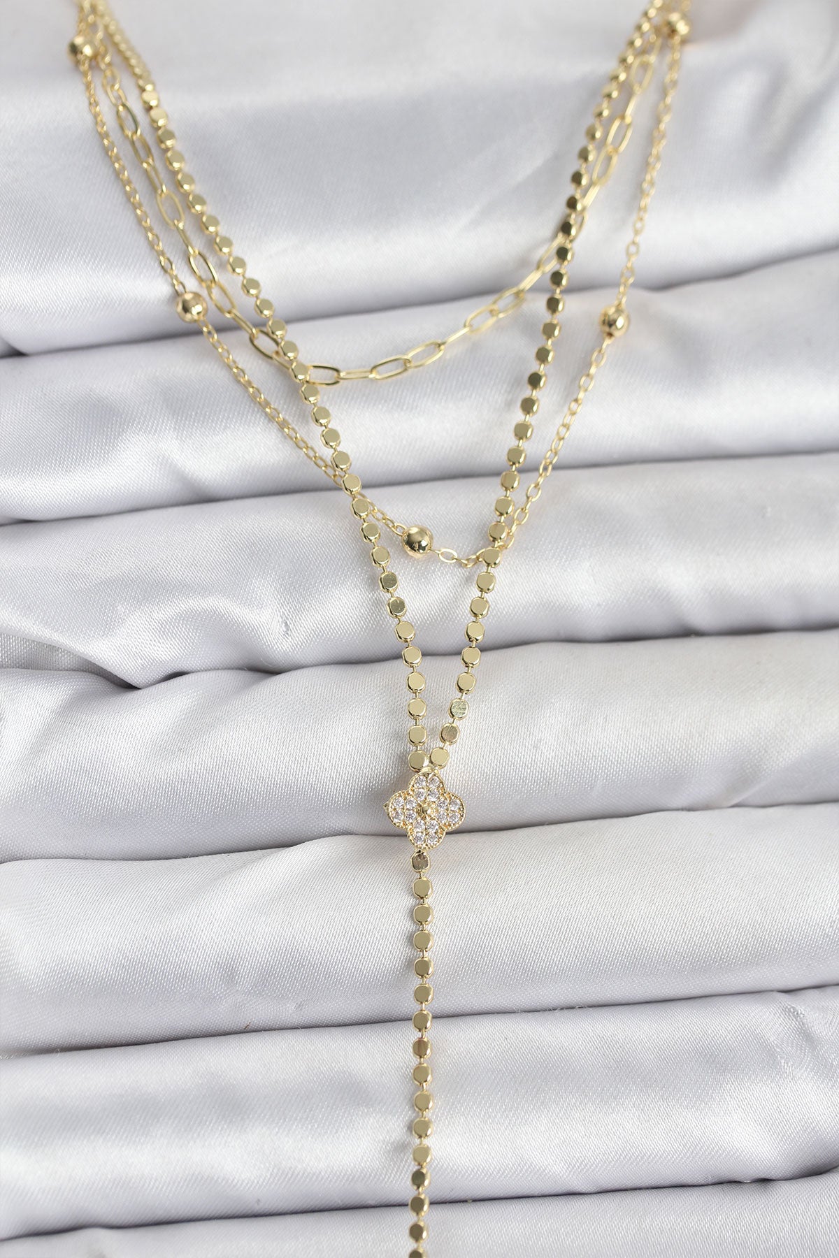 EBJ Rice Gold Color Clover Model Detailed 3-Piece Set Y Women's Necklace with Zircon Stone - Tezoyuca