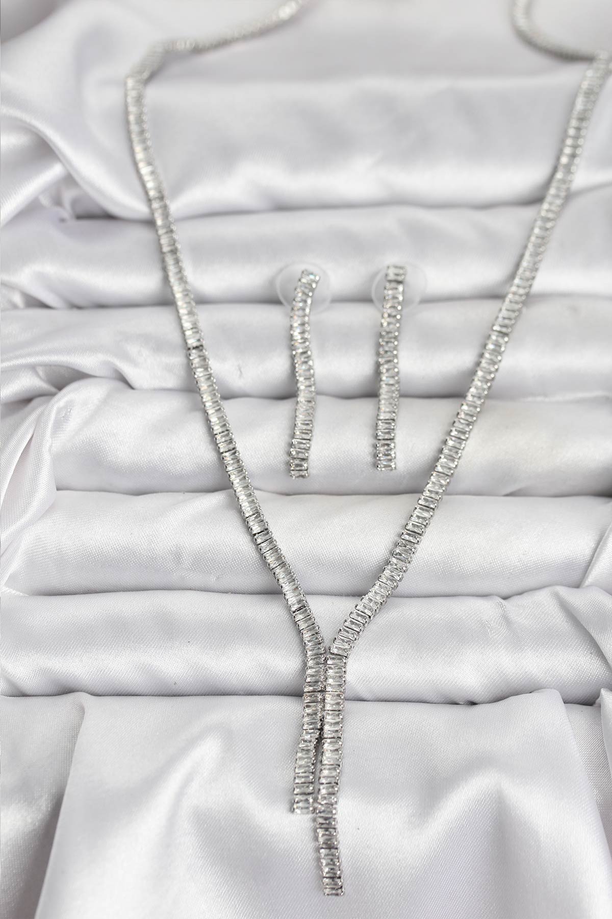 EBJ Silver Color Baguette Zircon Stone Women's Necklace Earring Set - Bragadiru