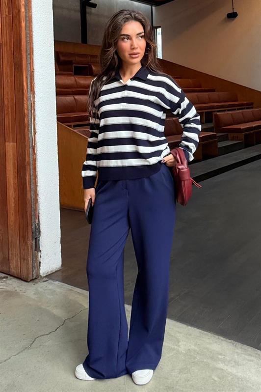 MDX Lacivert Çizgili Polo Yaka Düğmeli Kadın Kazak MG2561 - Coral Springs