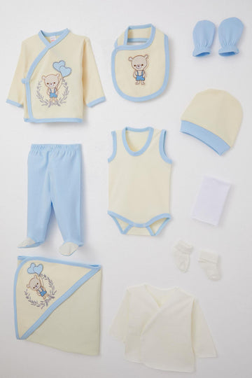 BRE Breeze Baby Boy Hospital Outfit 10-Piece Cute Bear Embroidered Heart Balloon 0-3 Months, Cream - Tuxpan