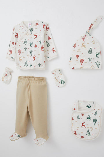 BRE Breeze Baby Boy Hospital Outfit 5 Piece Christmas Themed Deer Patterned 0-3 Months, Ecru - Novi