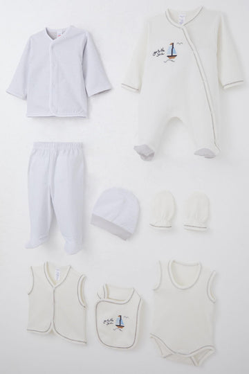 BRE Breeze Baby Boy Hospital Outfit 8 Piece Sailboat Cross-Stitch Embroidered 0-3 Months, Ecru - Thornton Heath