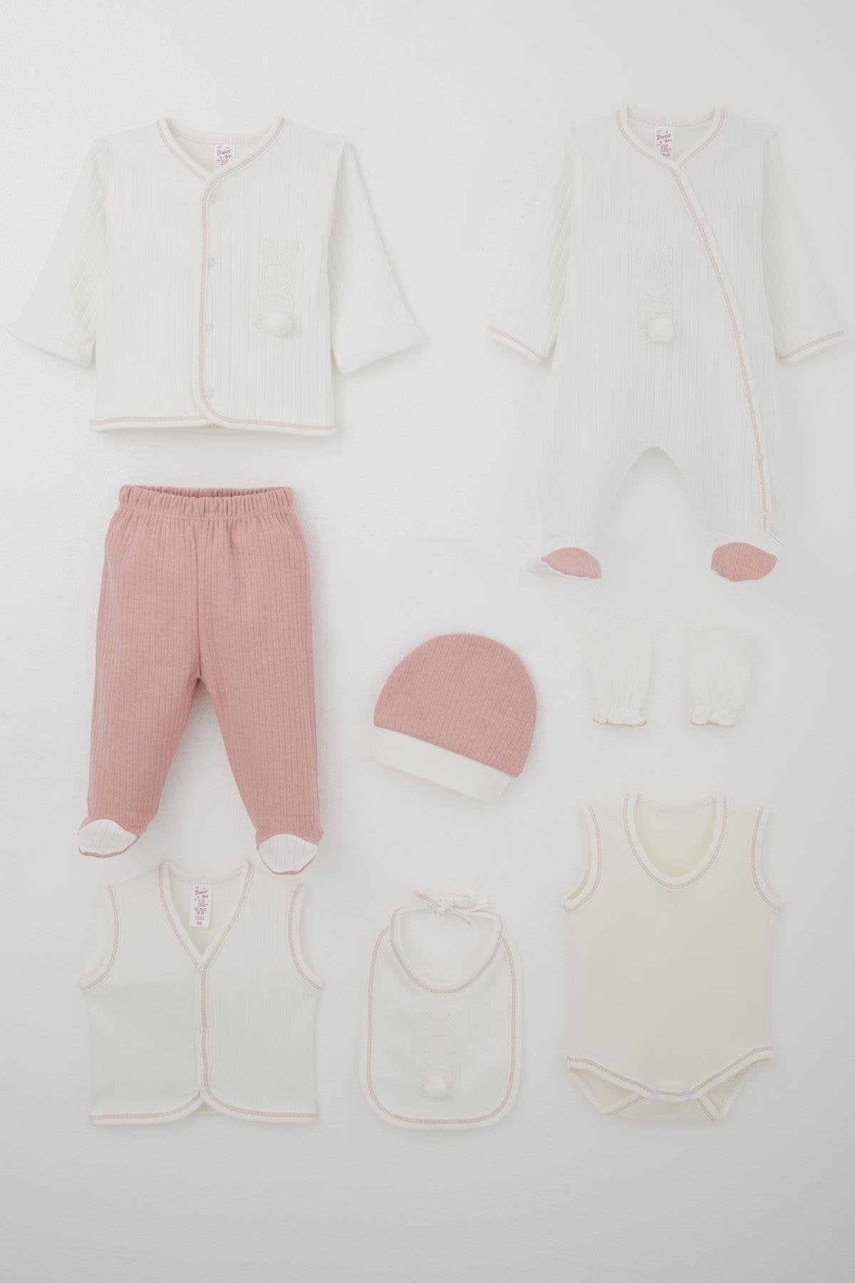 BRE Breeze Baby Girl Hospital Outfit 8 Piece with Pom Pom Bunny Embroidery 0-3 Months, Ecru - Meppen