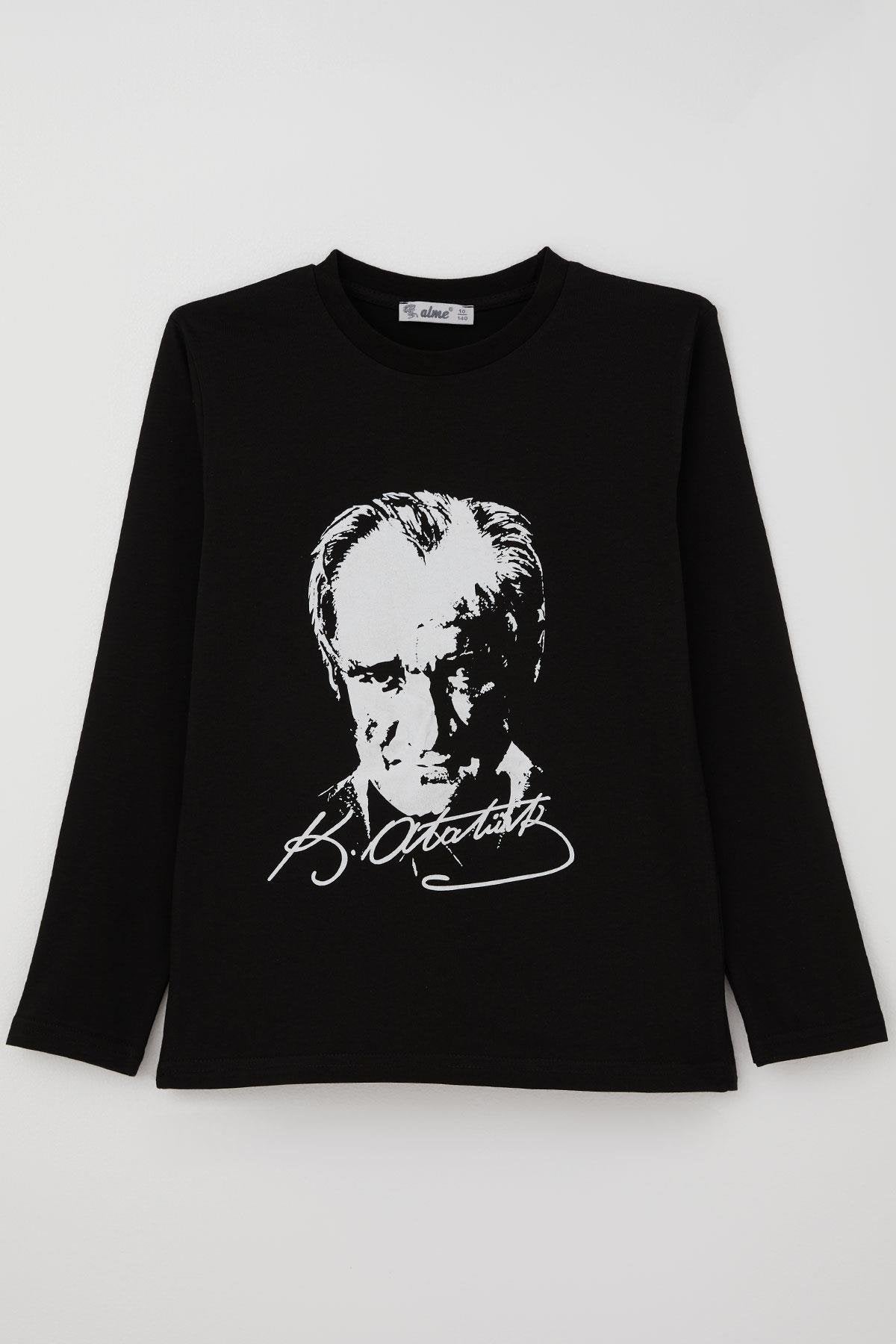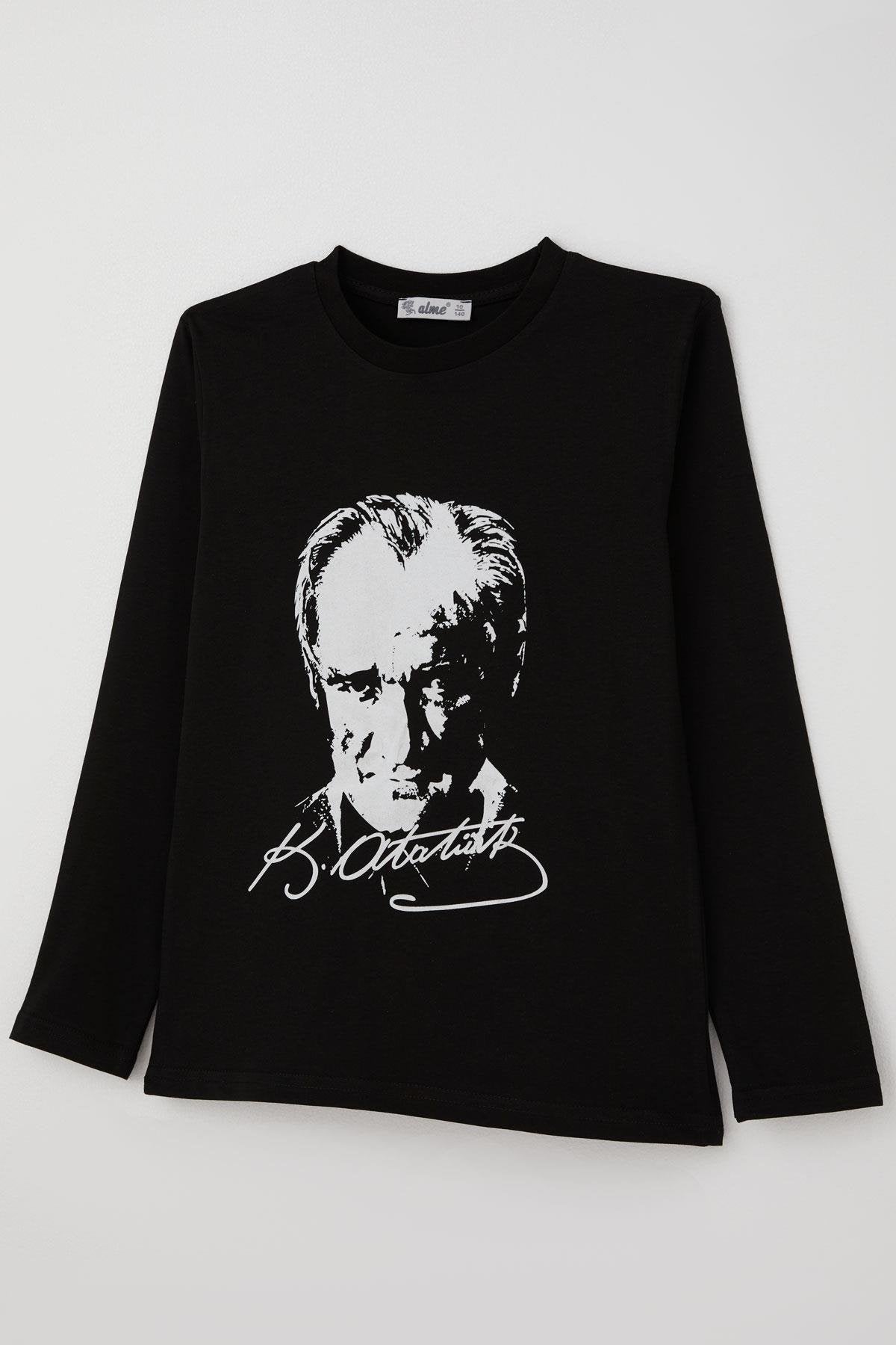 BRE Boys' Long Sleeve T-Shirt with Atatürk Portrait and Signature, 27 Years, Black - Ocala