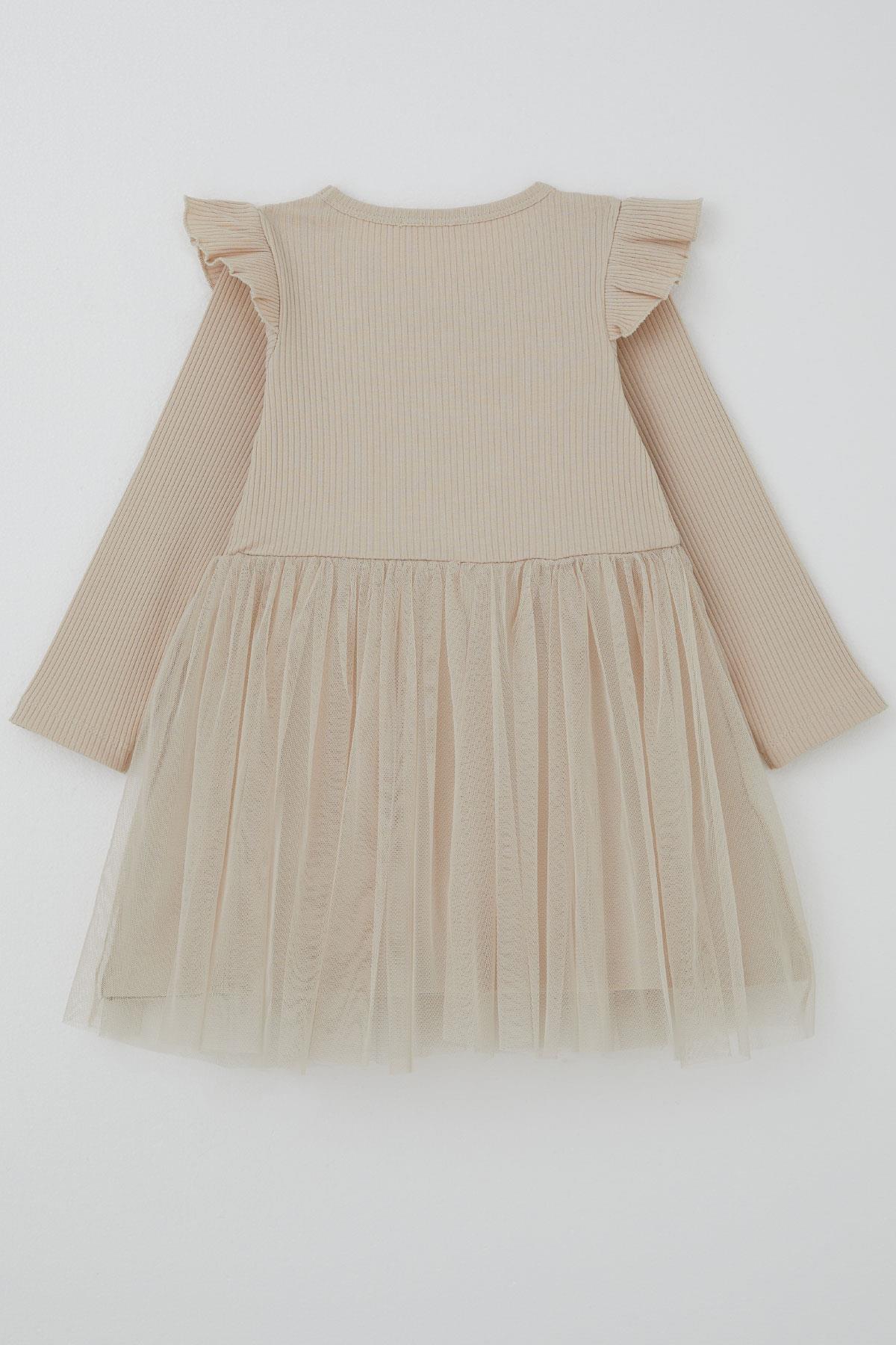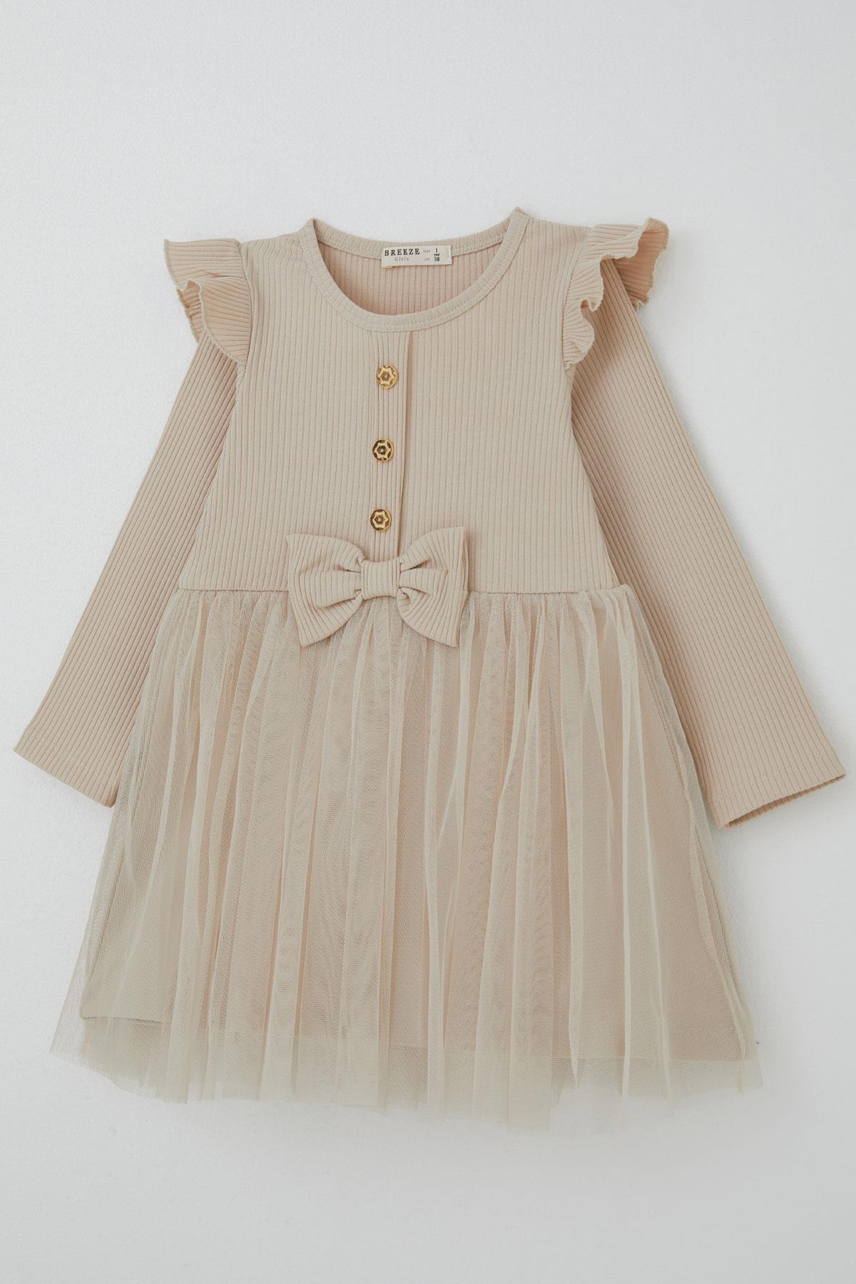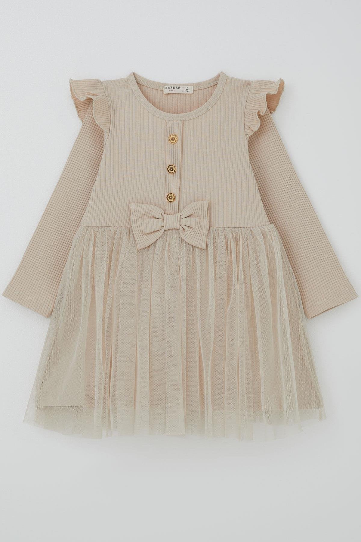 BRE Breeze Girl Child Long Sleeve Dress with Frill Detail and Bow 3-8 Years, Beige - Westminster
