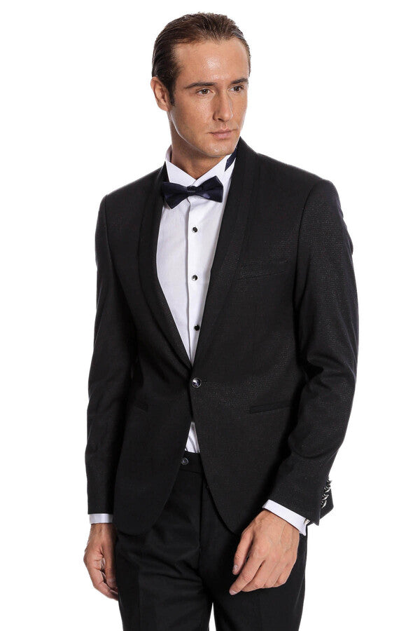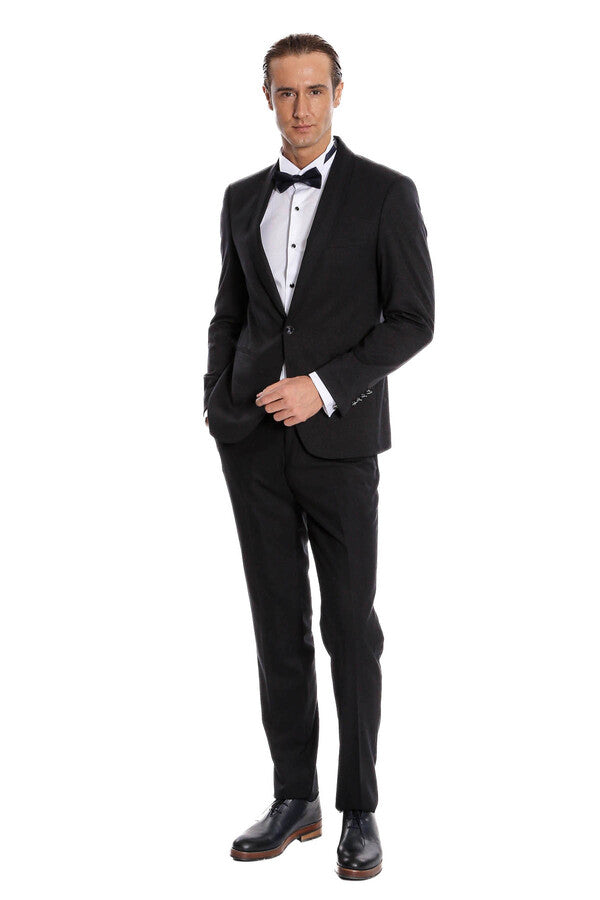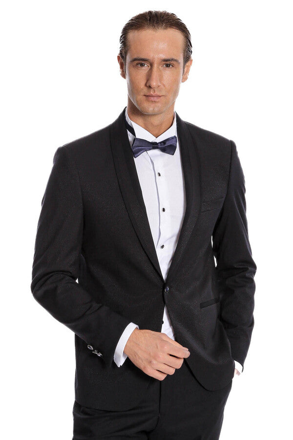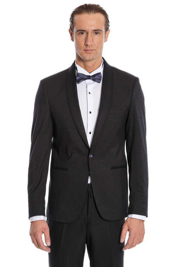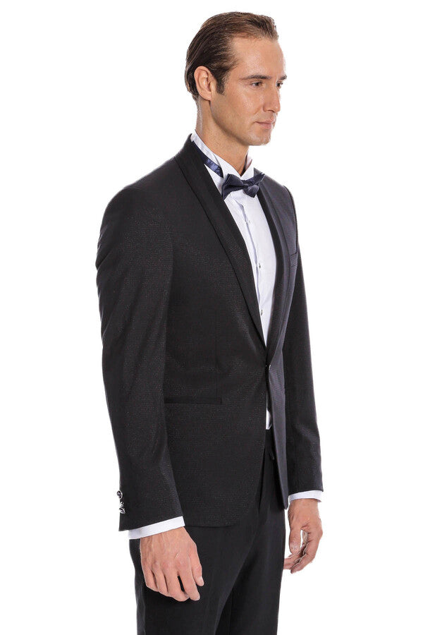 Among the suit models is an Italian cut tuxedo suit. This shawl collar suit is self-patterned. This one-button jacket model has double slit. The suit is completed with a slim fit, straight and black trousers. It is a stylish, modern and beautiful tuxedo model that will look good on you. Buttons on the sleeves of the jacket add a richer look to the jacket. You will be very comfortable in the jacket produced with slim fit mold.