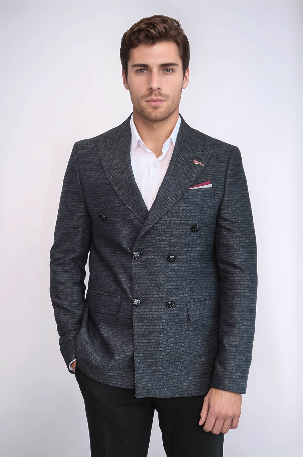Details: Two button, peak lapel, double breasted