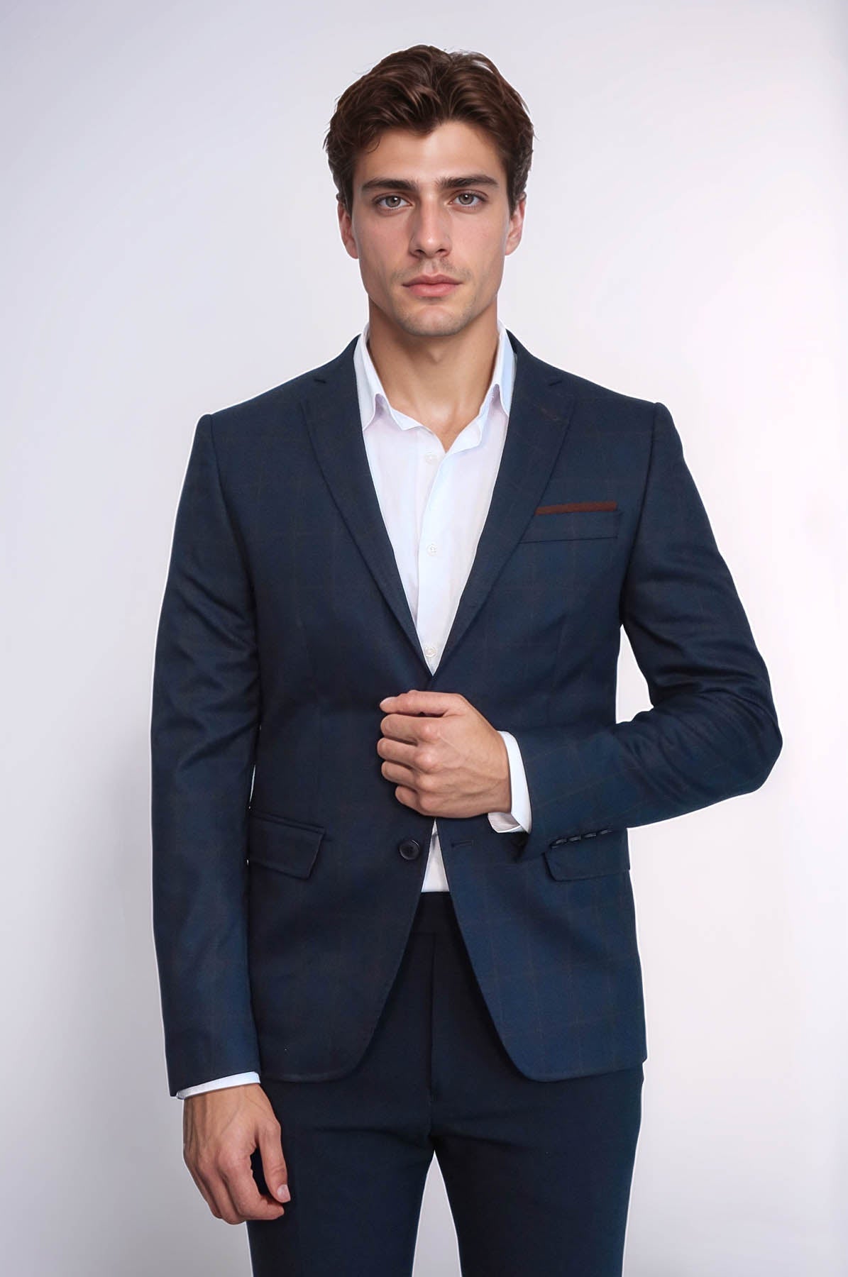 Elevate your style with the Plaid Navy Blue Jacket from Wessi. This jacket features a classic plaid design and comes with a matching handkerchief. With its sleek and sophisticated look, this jacket is perfect for any occasion. Add a touch of elegance to your wardrobe with Wessi.