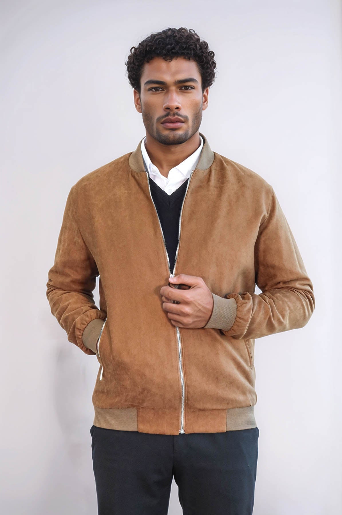 Bomber jackets come in cuts suitable for all ages and body types. Choose from striped, suede, plaid and colored models to find the right fit for you. This tan bomber jacket has a simple design with no pattern, which makes it versatile. The zippered pockets give it a modern feel and are functional at the same time. The high-quality material makes the jacket comfortable and durable. You can combine this tan bomber jacket with a white plain shirt or a black knit sweater underneath. For underwear, you can choose a pair of slim-fit trousers in a dark color or a pair of stylish fabric trousers. The color of your trousers is important to emphasize the elegance of the jacket. For shoes, leather oxford shoes or loafers would be a great option. To add a touch more sophistication to your style, you can wear a thin tie or a quality wristwatch. This outfit can be worn for a wide range of occasions, from business meetings to special events. The tan bomber jacket allows you to stand out with its elegance and elegance and takes you one step ahead in any environment.