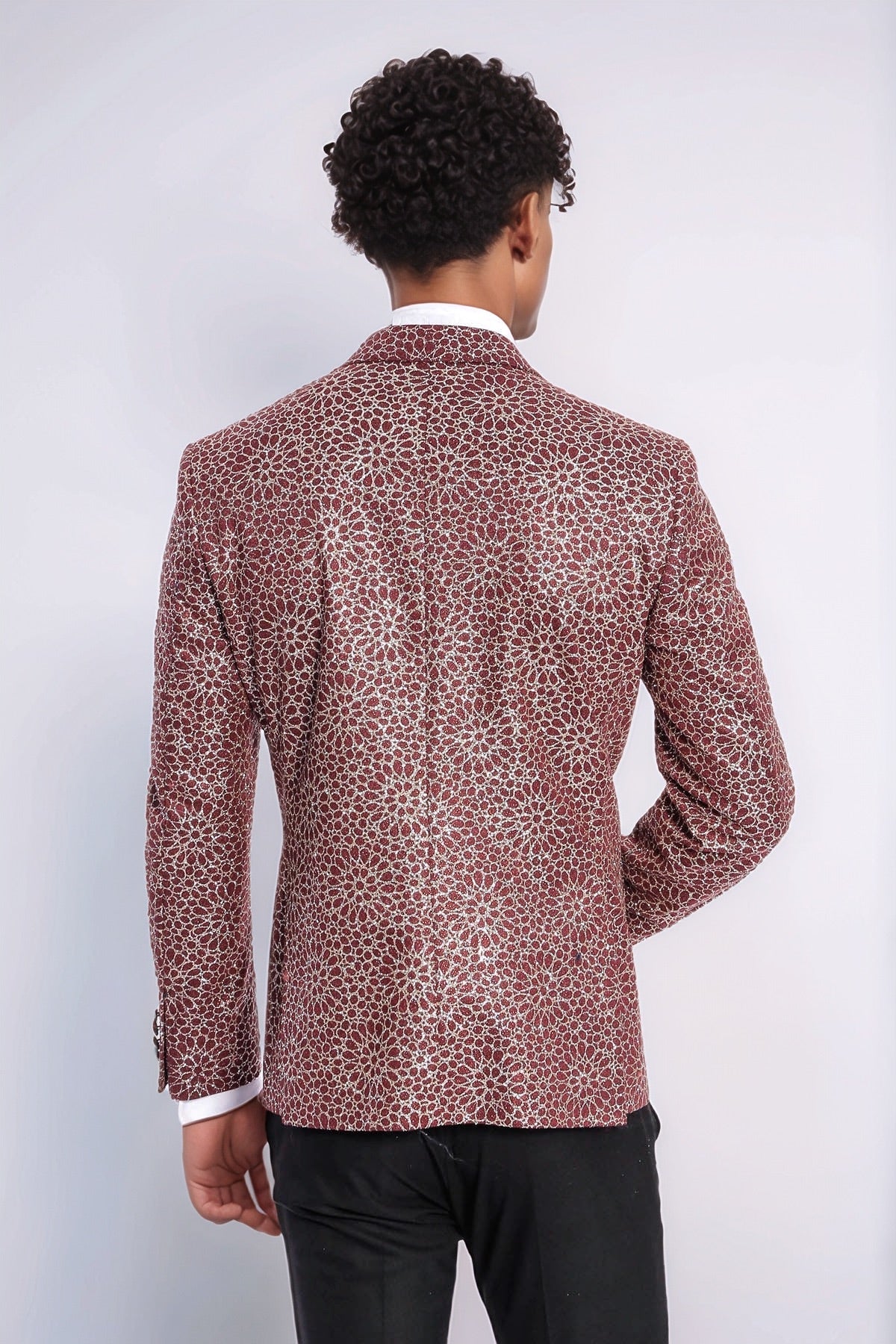 WSS Flower Embroidered Pattern Burgundy Men Tuxedo Blazer - Soteapan