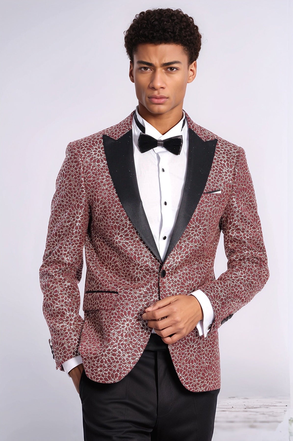 Tuxedo jackets, the indispensable representative of elegance in menswear, add a magical touch to your style with their sparkling patterns. Worn at special invitations, gala nights or special occasions, these jackets give your style an aristocratic air. Tuxedo jackets are one of the must-have pieces in every man's wardrobe and always guarantee your elegance with their slim fit cuts. With its embroidered floral patterns and elegant burgundy color, this men's tuxedo jacket offers a sophisticated style for special occasions, invitations, parties and graduation ceremonies. With this tuxedo jacket, you will make unforgettable memories and all eyes will be on you with impressive combinations. You can combine your burgundy embroidered floral print tuxedo jacket with a white shirt and black slim fit pants for a classic elegance. You can emphasize your elegance by completing your outfit with black oxford shoes and a black bow tie.