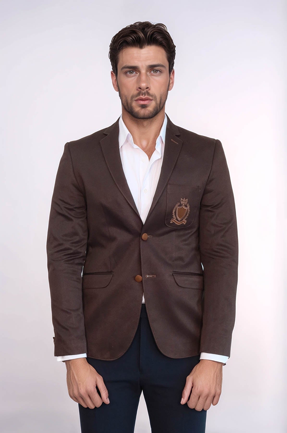 Expertly crafted with high-quality crested cotton, this brown jacket features 2 buttons and 3 pockets for a sophisticated and functional addition to your wardrobe. Perfect for any occasion, its timeless design offers both style and practicality. Stay comfortable and stylish with this must-have jacket.