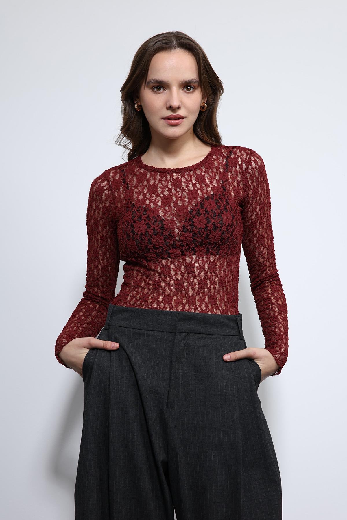 ANT Antioch Bordo Dantel Detaylı Transparan Bluz - Alsdorf