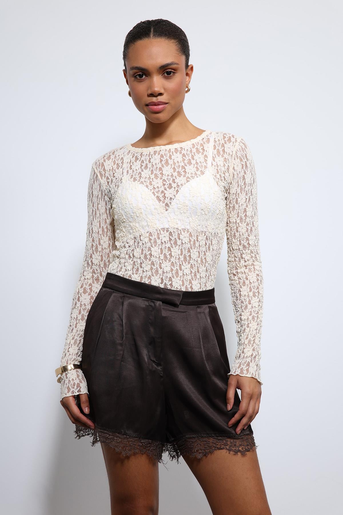 ANT Antioch Ekru Dantel Detaylı Transparan Bluz - The Colony