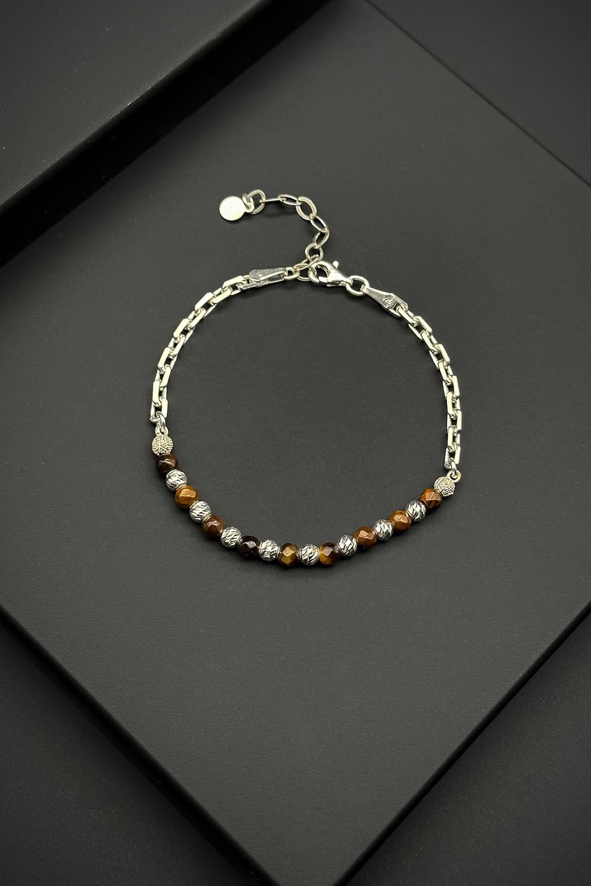 FRNCH 925 Sterling Silver and Tiger Eye Natural Stone Brown Men's Bracelet; Material: 925 Sterling Silver and Tiger Eye Color: Brown Size: Adjustable; Sent in FRNCH Box; It is recommended to keep away from cosmetics, perfume, and cleaning products.