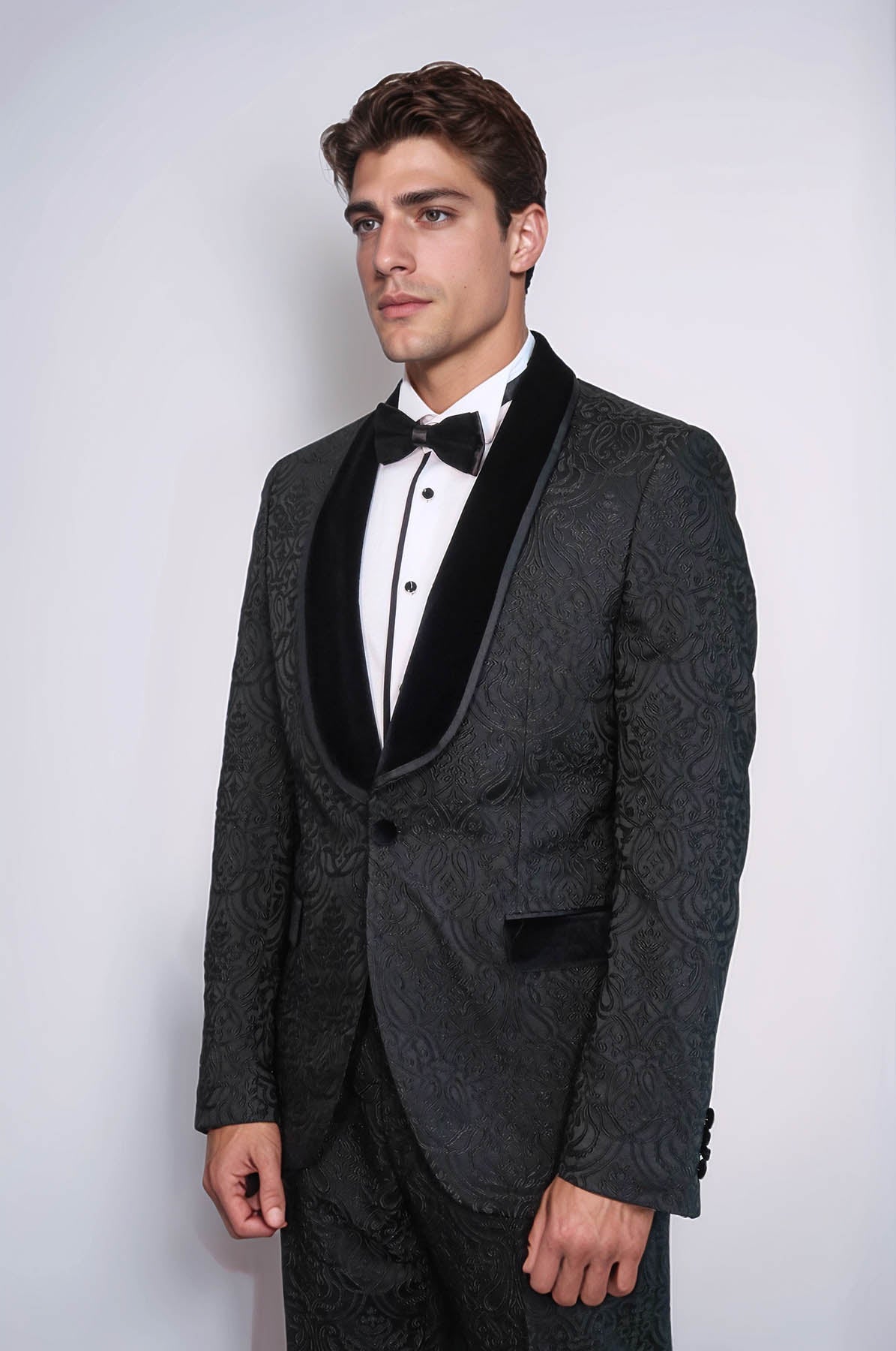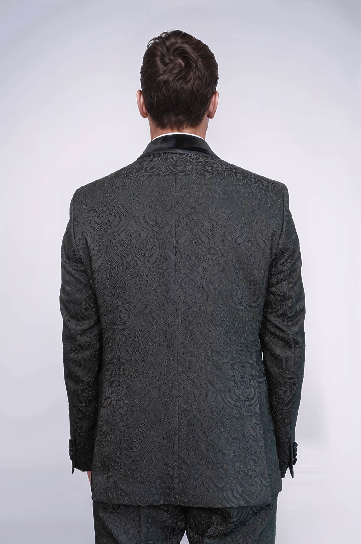 Elevate your style with our 2 piece damask patterned velvet shawl collar black men's tuxedo suit from Wessi. Made with high-quality fabric, this suit exudes luxury and sophistication. Perfect for any formal event, it will make you stand out from the crowd with its unique design and impeccable fit.