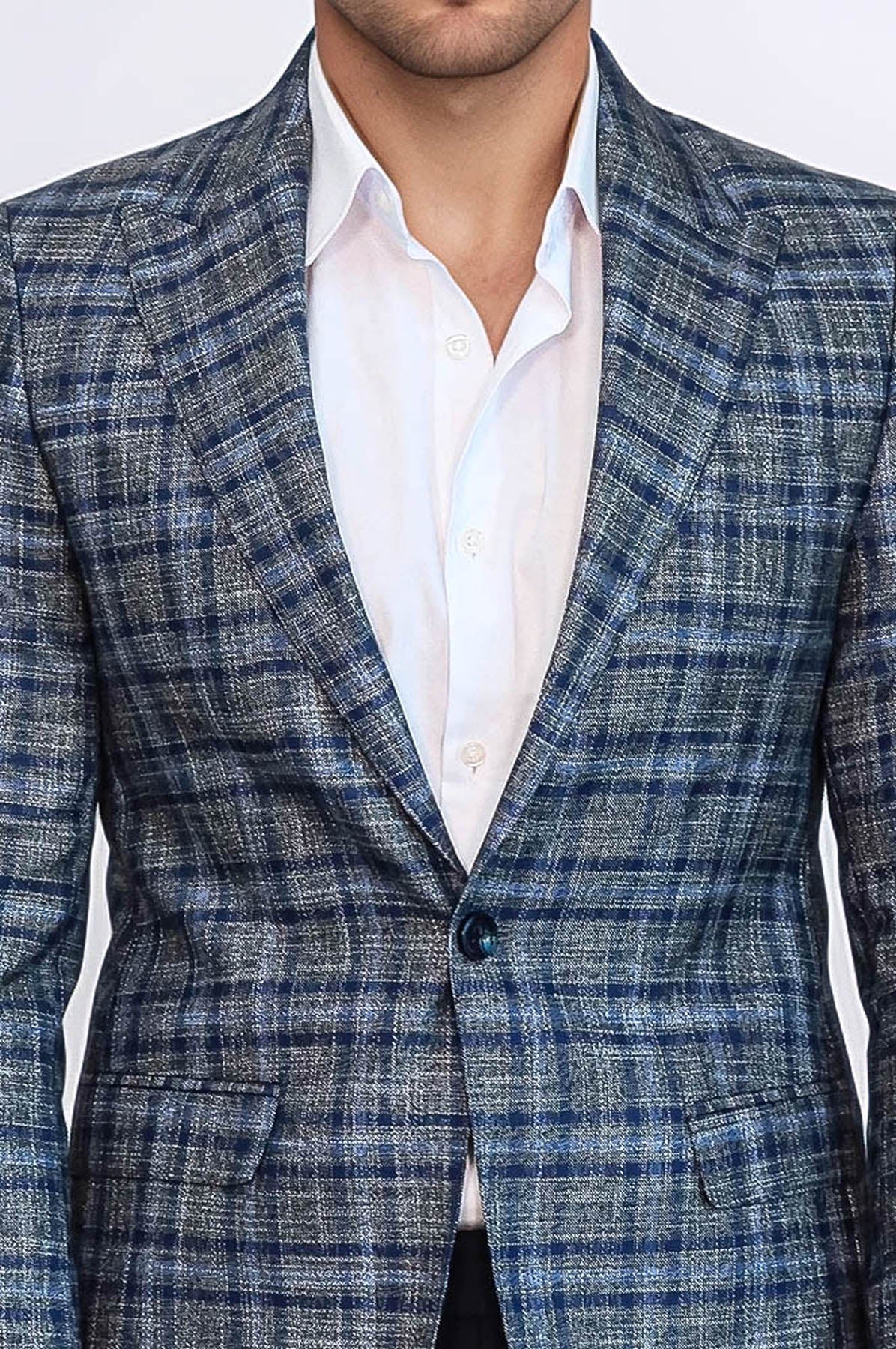 WSS Checked Slim-Fit Single Button Navy Blue Men Blazer - Ágios Dimítrios