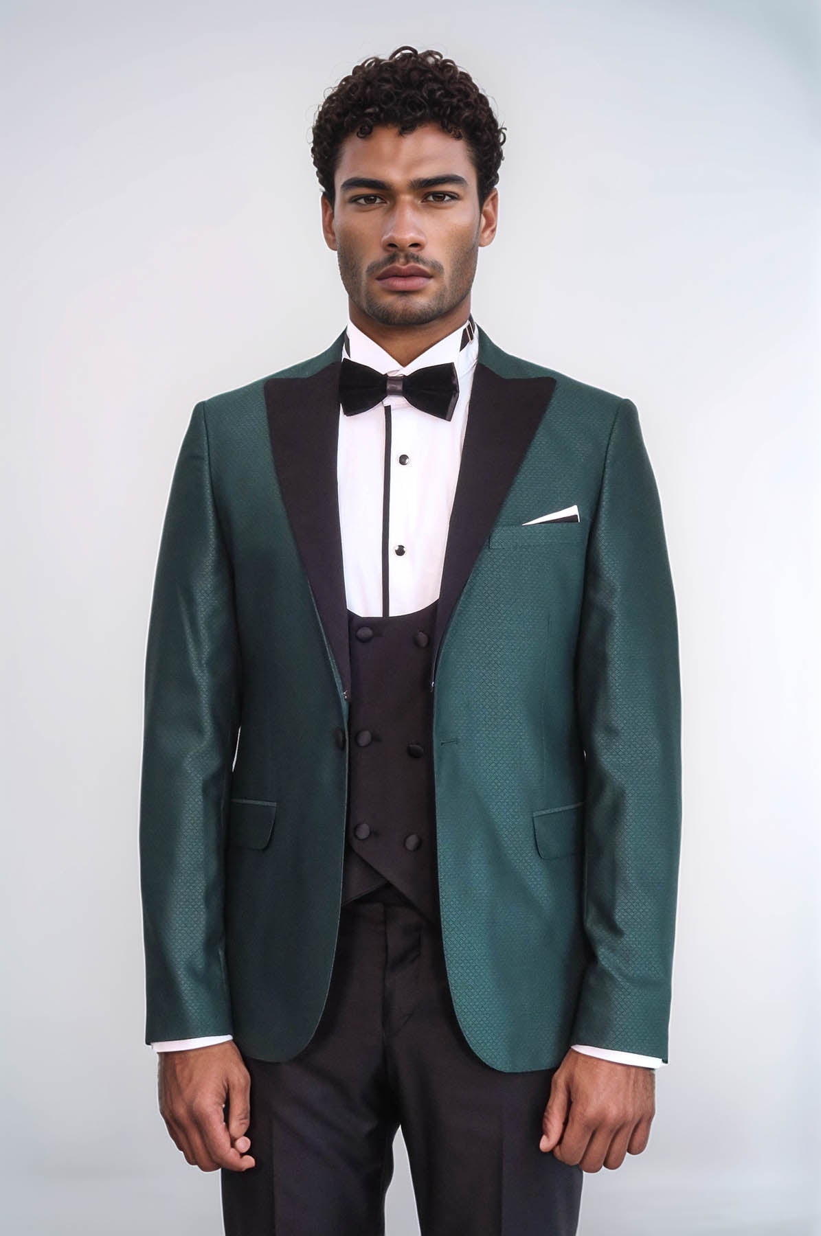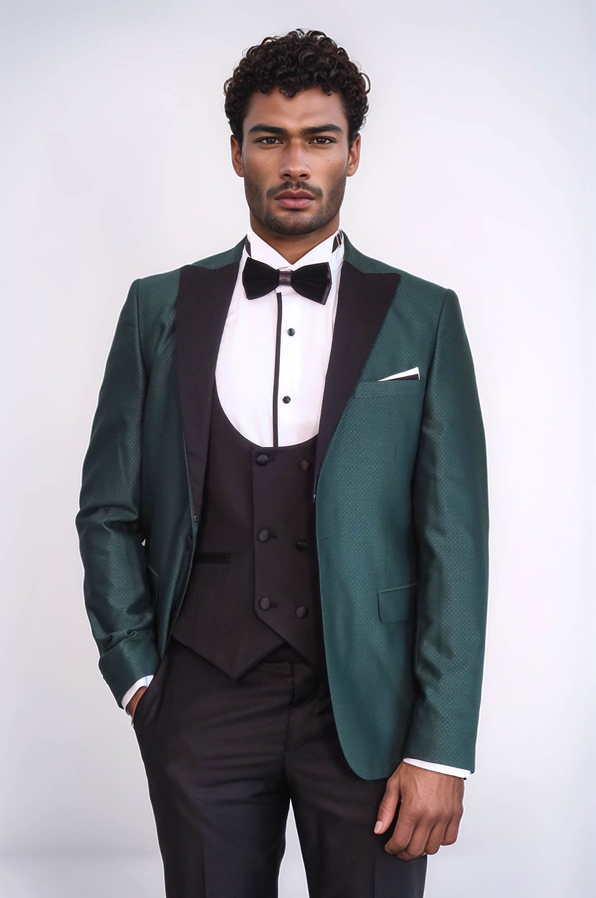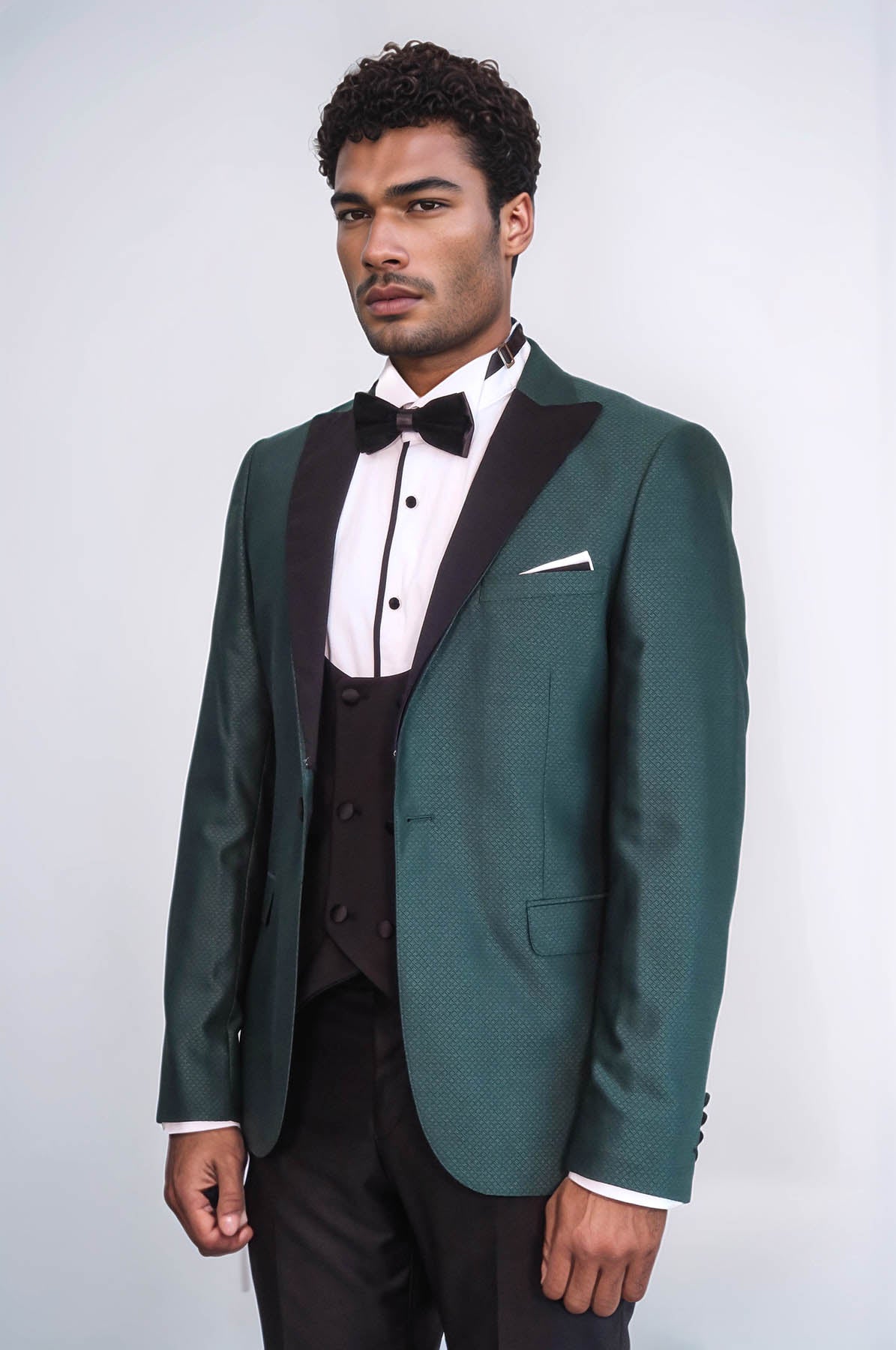 The pointed collar of the patterned dark green color tuxedo jacket model is black. It is a stylish and beautiful jacket with double slit. The double-breasted black vest model matches the dark green jacket. In addition to the plain patterned vest, the black colorless pants model completes this combination. The groom tuxedo model looks best on you with its slim fit pattern. There are three pockets on the jacket.