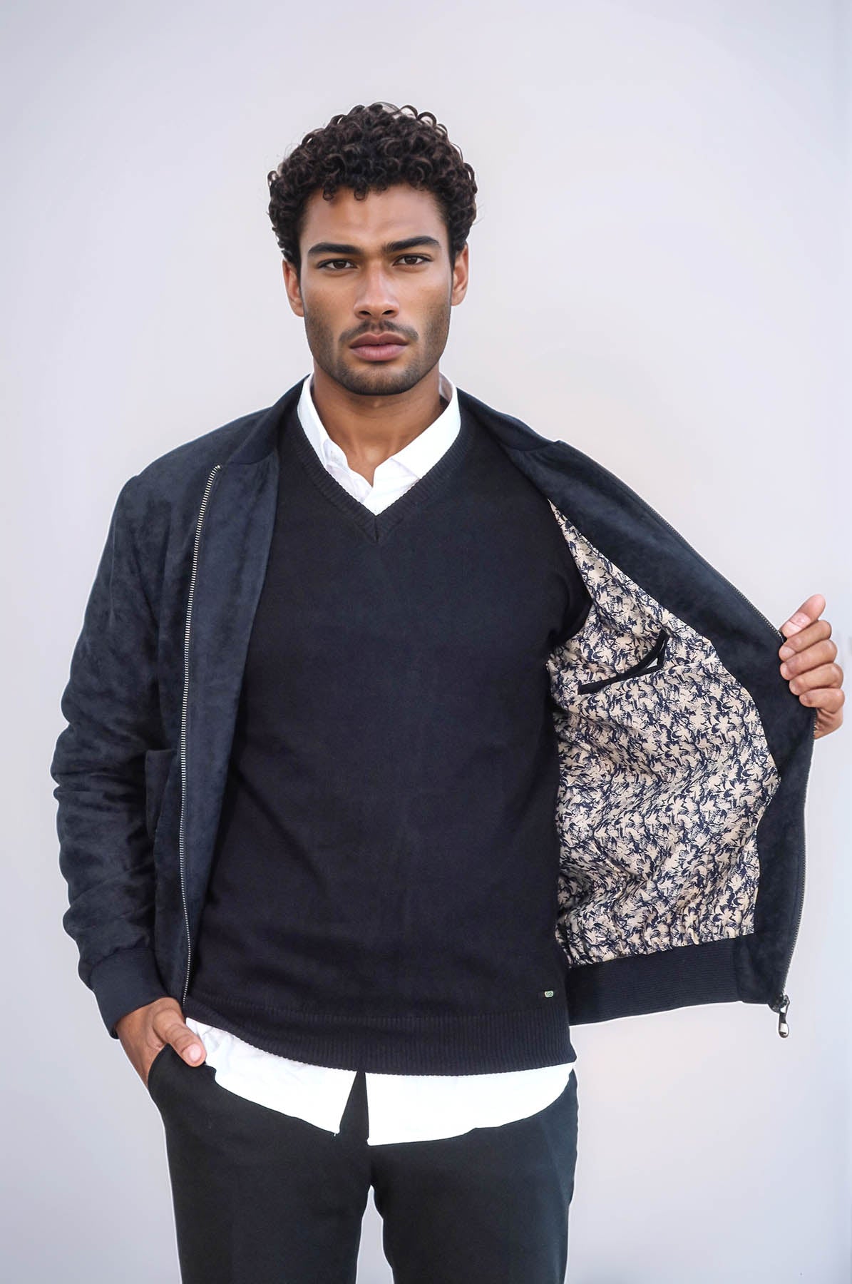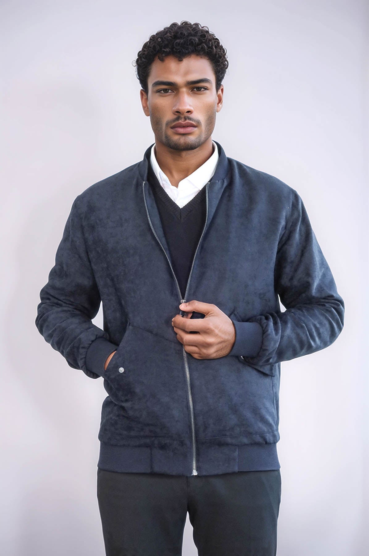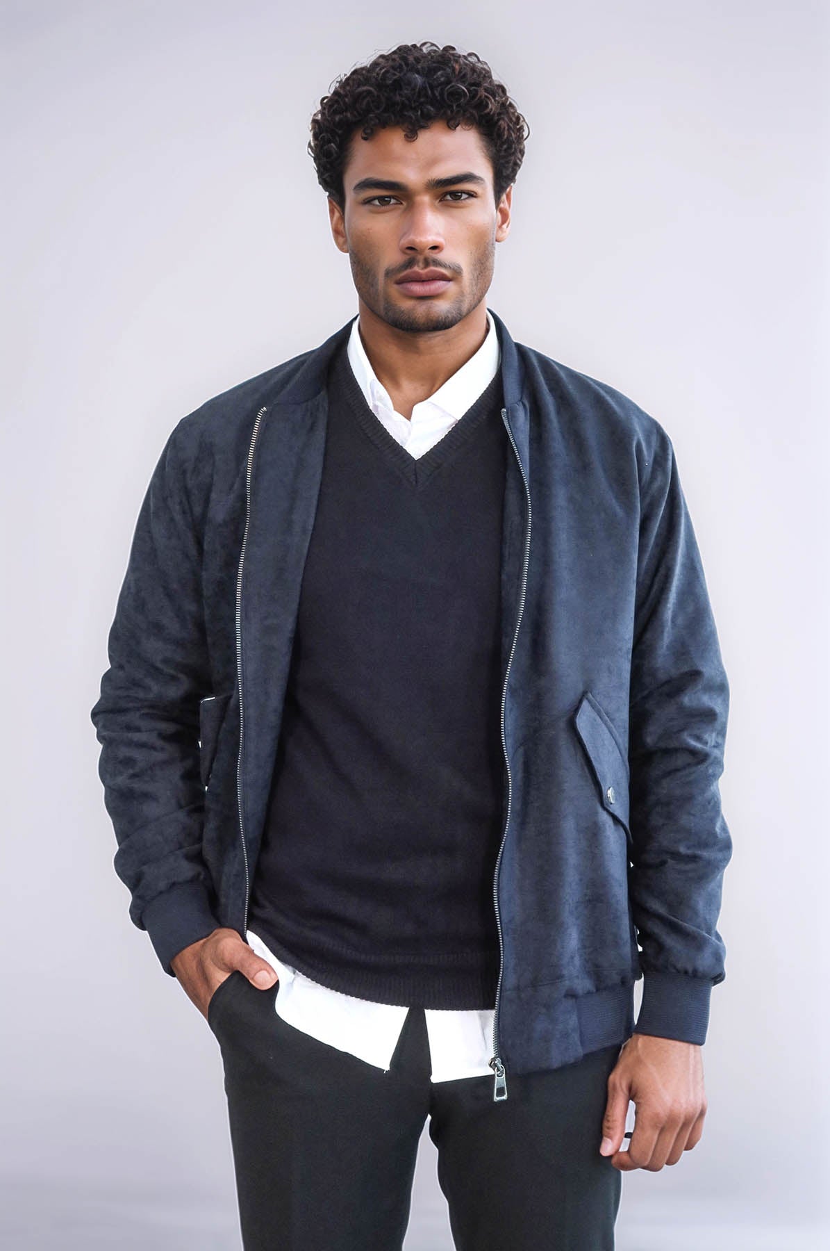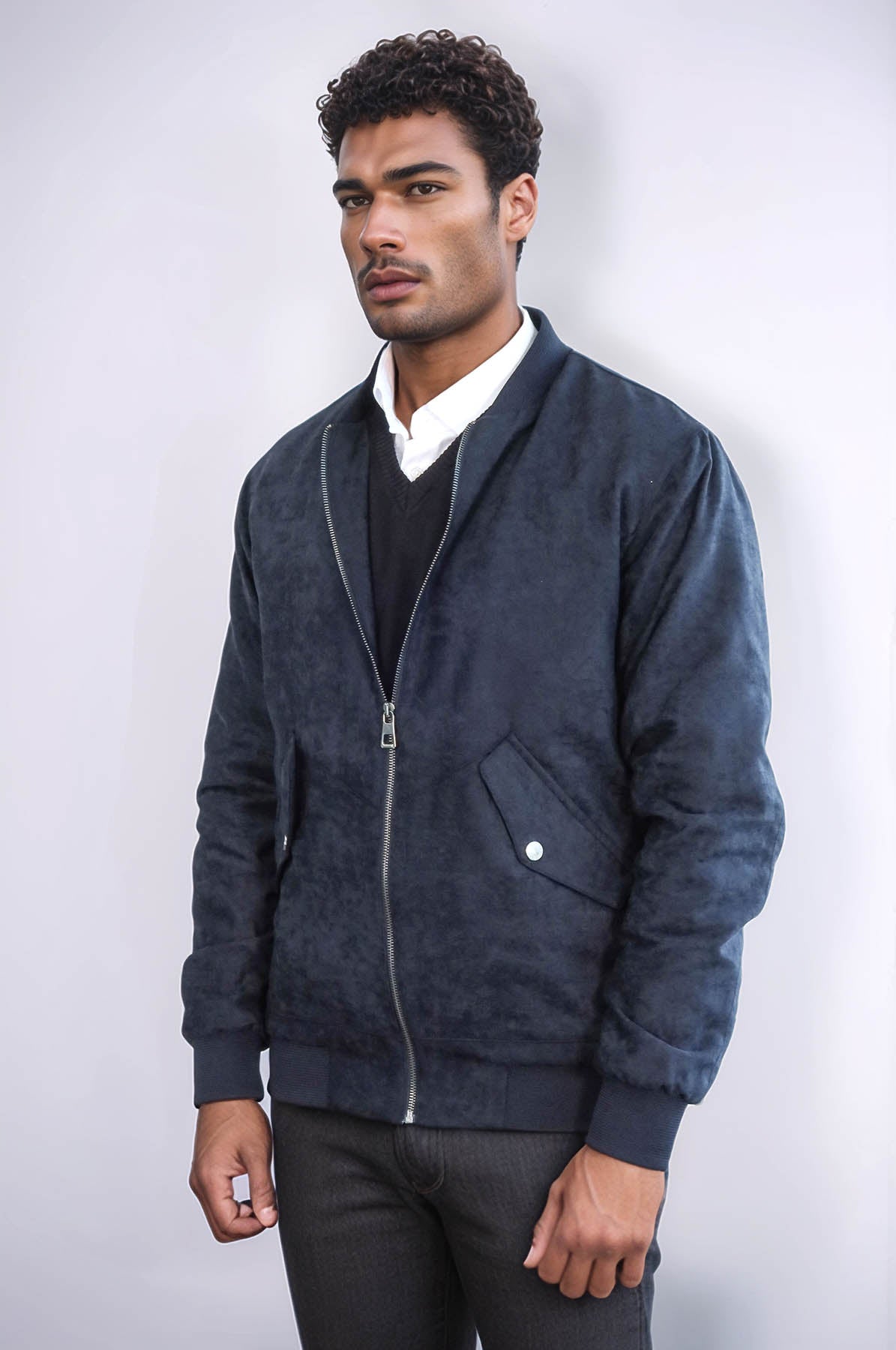 Bomber jackets allow men to express their clothing style in a creative and original way. Available in different fabric types, stitch details and color options, these jackets increase the vitality of your wardrobe and add dynamism to your style. This dark blue suede men's zippered bomber jacket with flap pockets is an ideal choice for men who want to achieve casual elegance. Here is a casual outfit suggestion you can make with this jacket: To combine this jacket with a casual style, you should choose comfortable pieces. Here is a combination suggestion: A white cotton t-shirt or a lightweight knit sweater are the perfect pieces to wear under the jacket. Classic cut dark blue jeans can form the basis of this outfit. They offer comfort and elegance. White sneakers or leather sneakers are a great option to complete your outfit. A minimalist wristwatch and sunglasses will add a touch of casual chic. This dark blue suede bomber jacket has a simple design with no pattern. The flap pockets and zipper details add a modern touch to the jacket. The soft suede material makes the jacket both comfortable and stylish. This outfit is perfect for day trips, meetings with friends or walking around the city. Dark blue suede bomber jacket will help you add a touch of elegance to your casual style with ease.