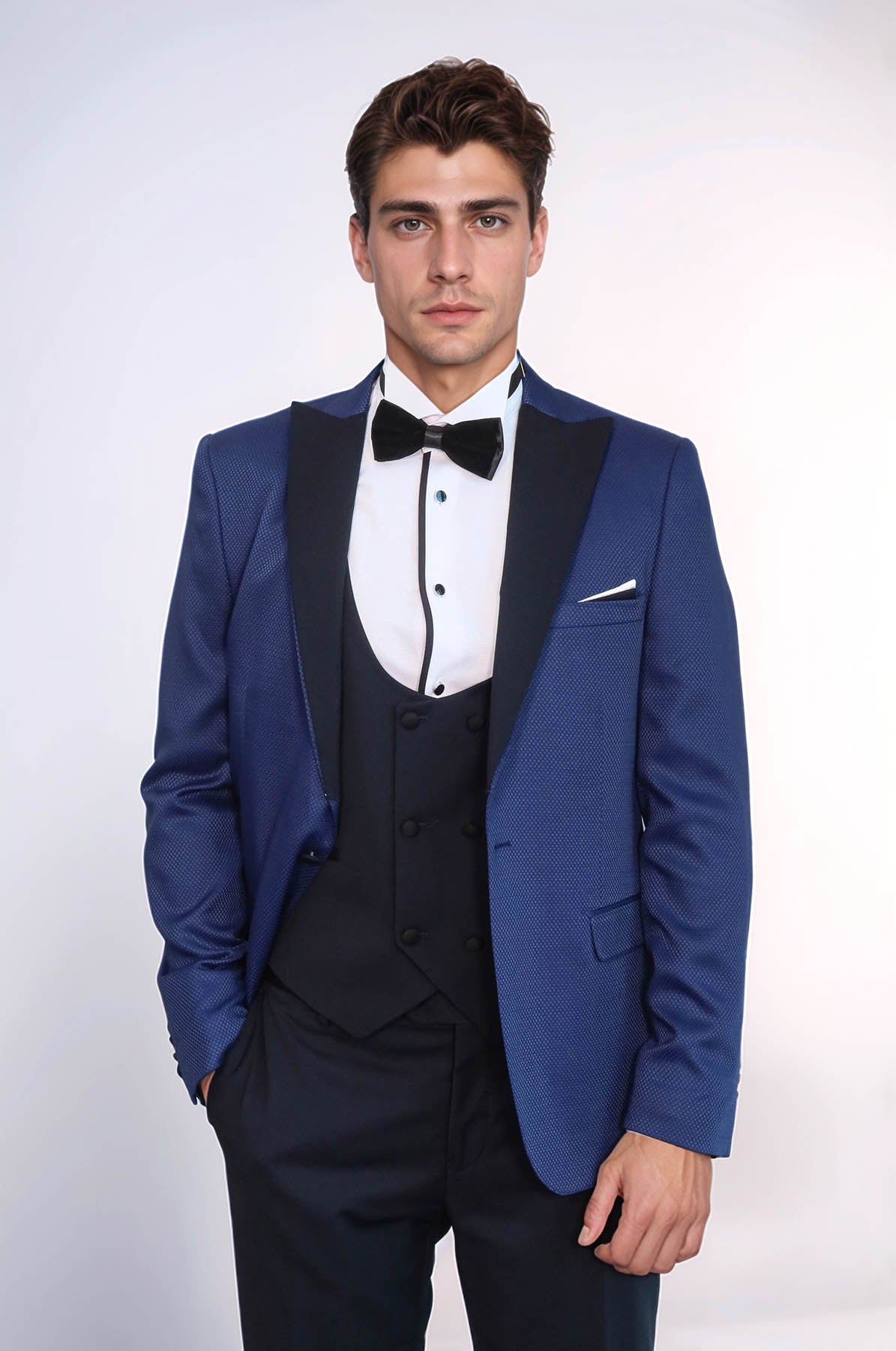 This men's jacket model with indigo color, self-pattern and three pockets is designed for grooms. The jacket of this grooming combi is a pointed collar and black color collar model. It has one button. It is combined with a double breasted vest. The combination is completed with a plain fabric trousers. This groom suit is made entirely of cotton fabric. This very stylish model has a double slit on the jacket. The groom suit is produced as slim fit.