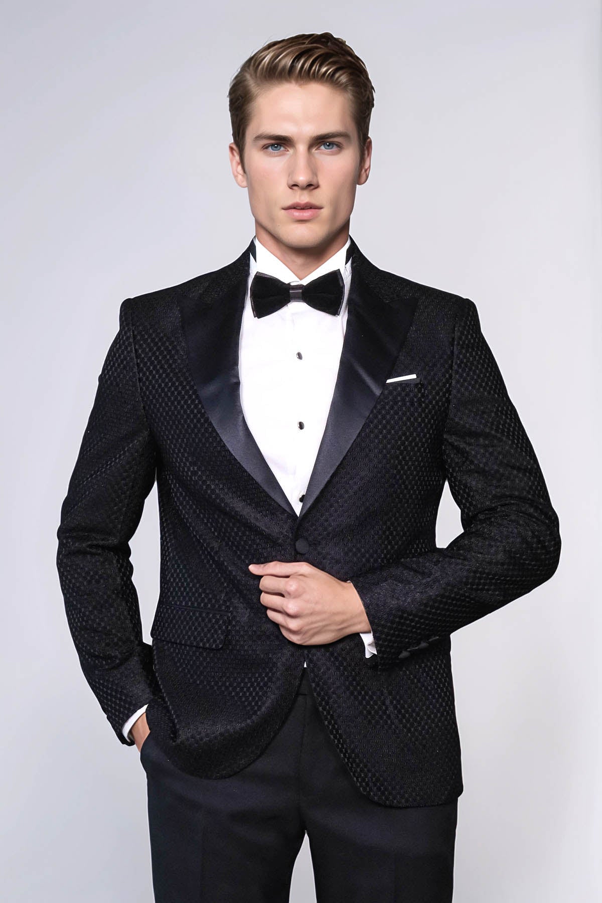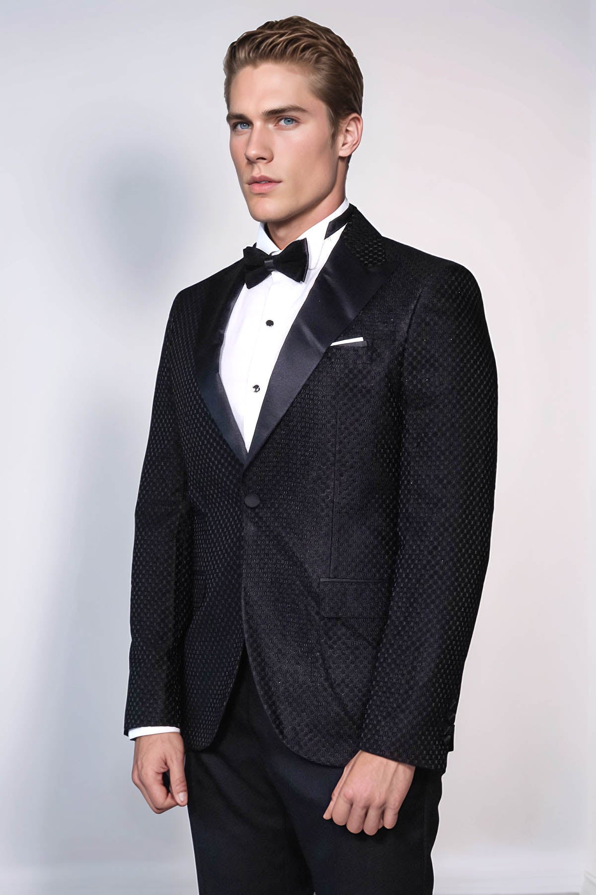 Pair the Wessi Satin Shawl Lapel Textured Royal Black Tuxedo Jacket with a crisp white tuxedo shirt, a black bow tie, and patent leather dress shoes for a flawless, sophisticated look. Elevate your ensemble with silver cufflinks and a silk pocket square for an extra touch of elegance.