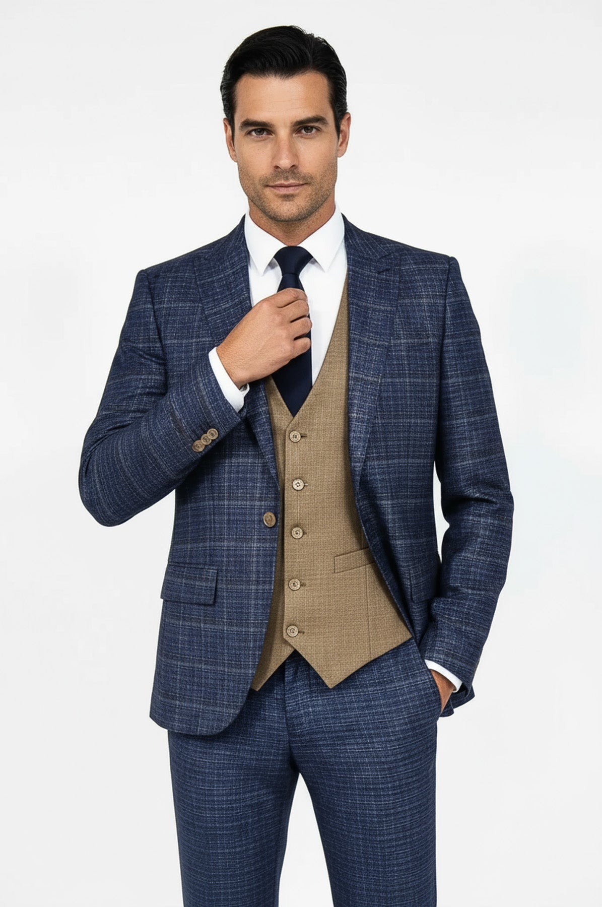 WSS Slim Fit Checked Patterned Navy Blue Men Suit - Chapel Hill