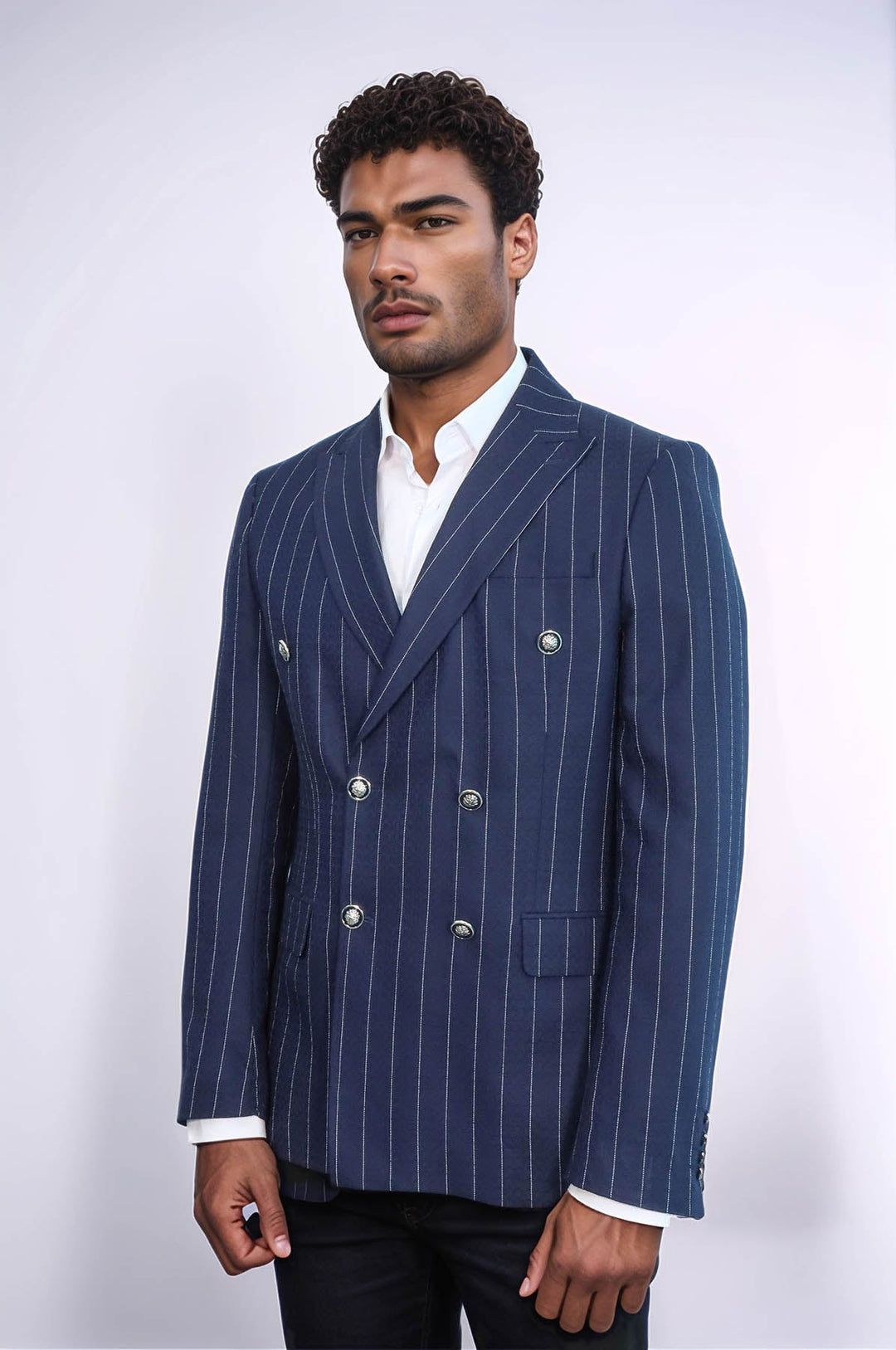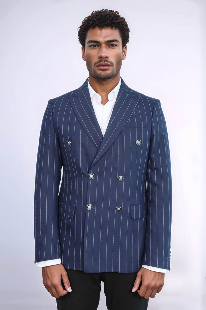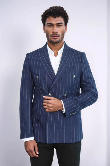 WSS Double Breasted Slim Fit Striped Navy Blue Men Blazer - West Vancouver
