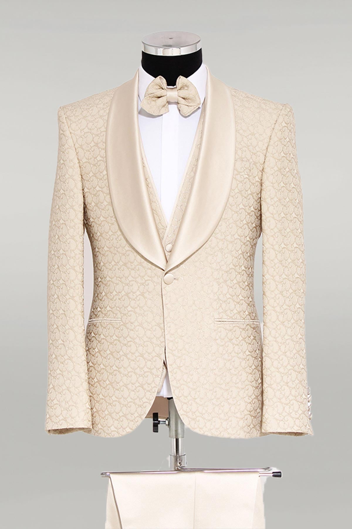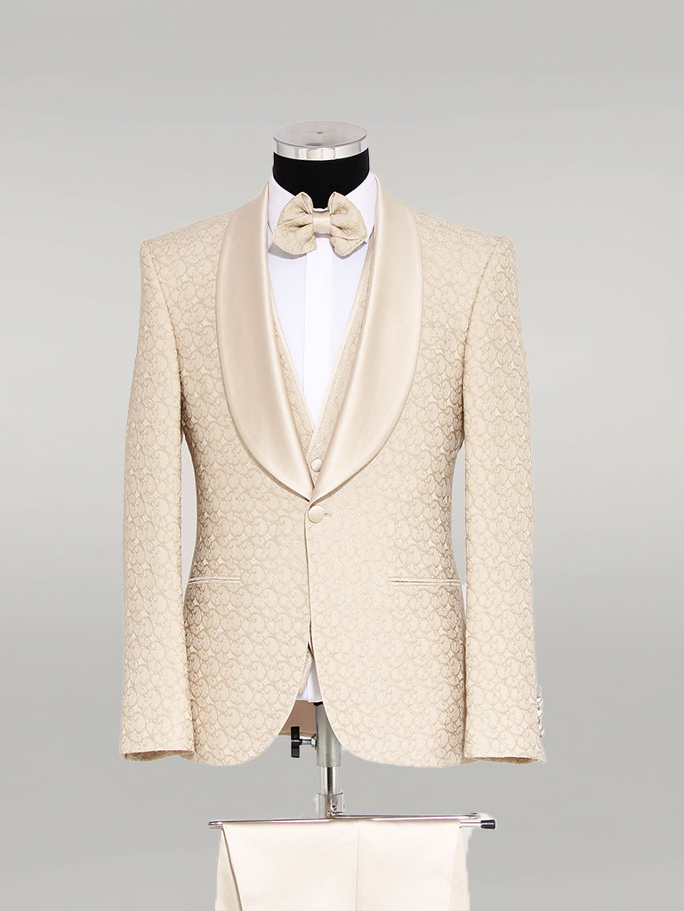 WSS 3-Piece Textured Satin Lapel Champagne Men's Tuxedo with Bow Tie - Saint-Chamond
