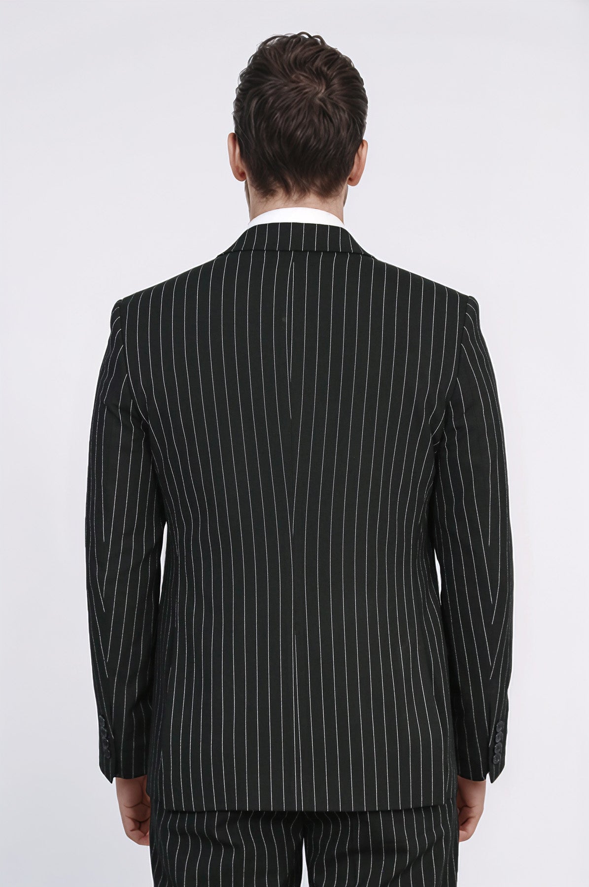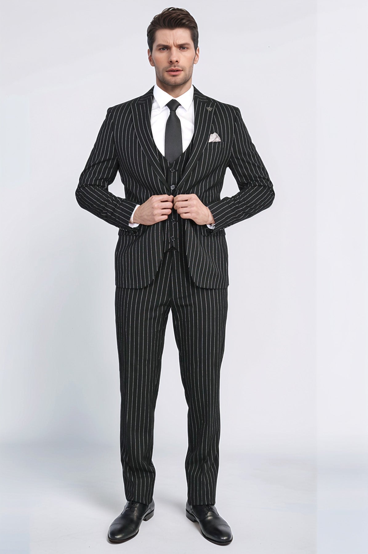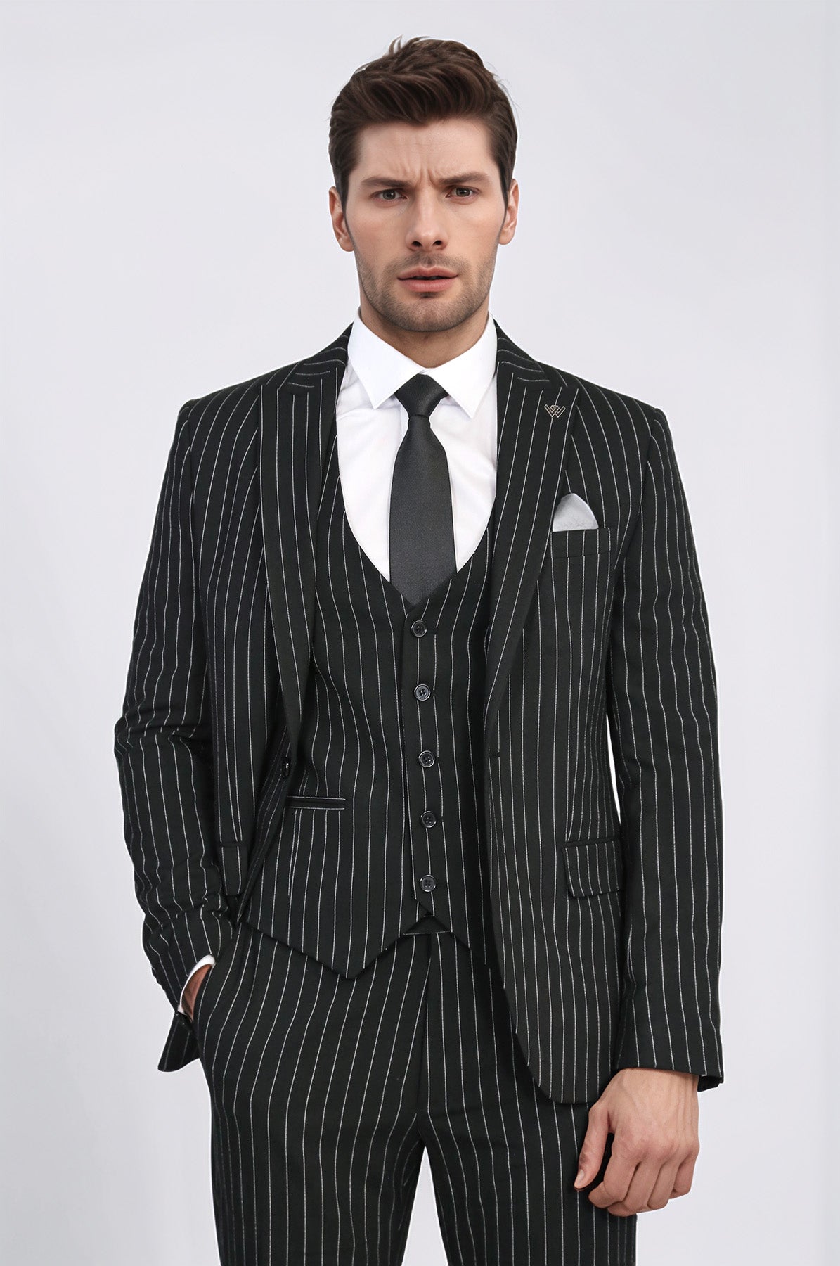 Striped Single Button with Vested Black Men’s Suit - Wessi