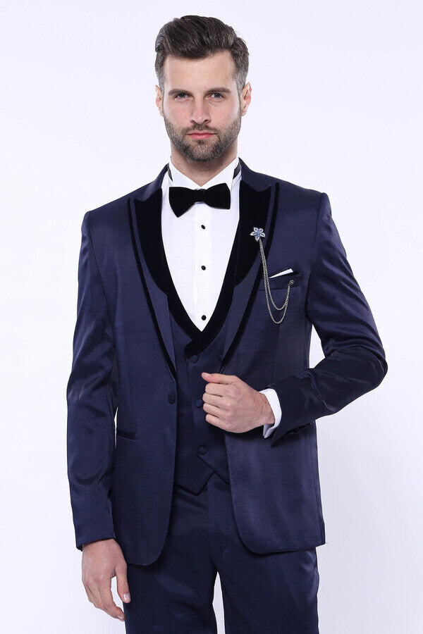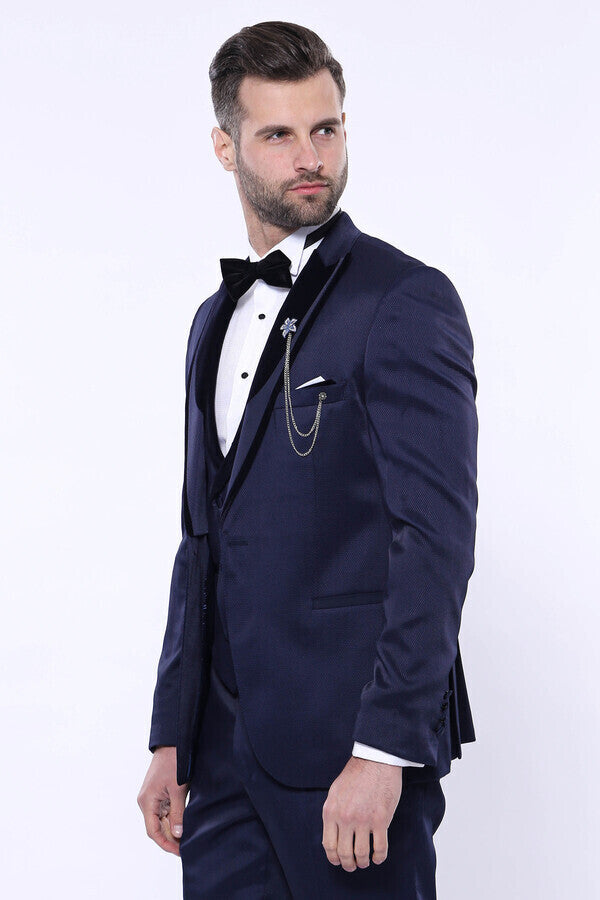WSS Patterned Velvet Lapel Navy Tuxedo - Florin