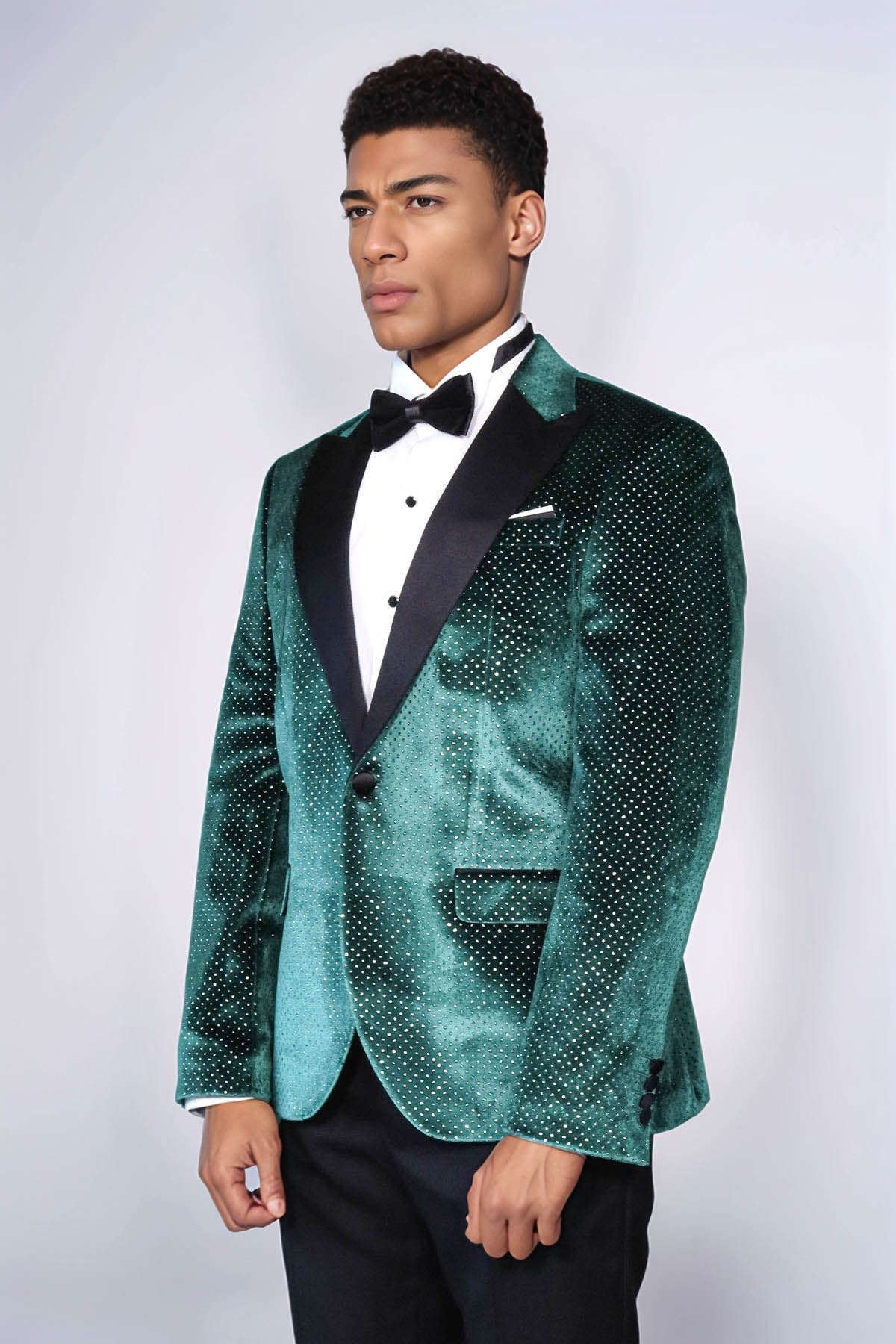 The Wessi Sparkling Dotted Green Tuxedo Jacket is a bold and refined choice for men who want to make a lasting impression. Made from luxurious green velvet fabric, this jacket is adorned with a shimmering dotted pattern, adding a sophisticated yet modern touch. The black peak lapel provides a striking contrast, ensuring a sharp and elegant silhouette, perfect for formal and evening events.