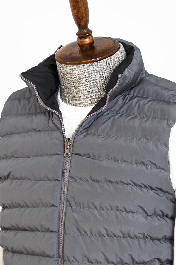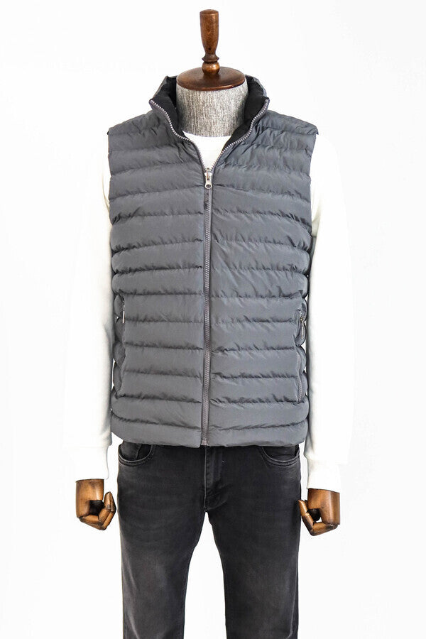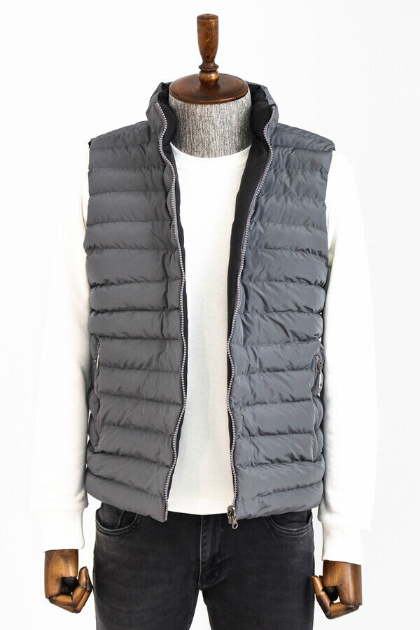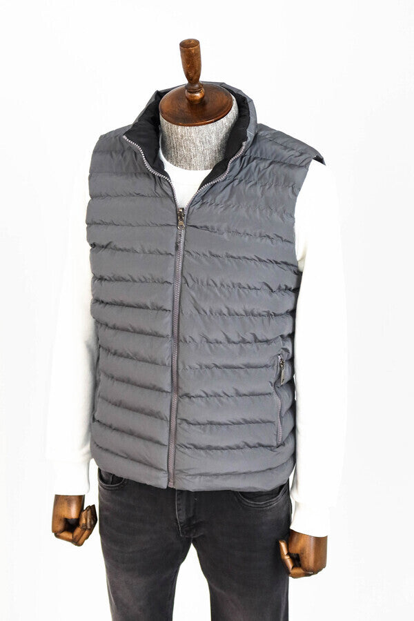 Men's winter vests are the perfect piece of clothing to keep you warm and complement your style in cold weather conditions. These vests are equipped with high-quality insulation materials and offer protection against cold winds. A practical and stylish option, this gray men's winter vest features two pockets, a zip fastening, a stand-up collar and quilted stitching. It is also a versatile product with its two-sided feature. It offers a sporty style while keeping warm and comfortable against cold weather conditions. You can combine this gray winter vest with a black or navy blue sports sweatshirt for a casual and sporty look. You can choose a pair of sporty cut black or gray jeans underneath. You can emphasize your style by wearing white sneakers or sneakers as shoes. In addition, don't forget to add a sports hat and sunglasses. This outfit is ideal for spending time out with friends, attending sporting events or for a relaxed weekend.
