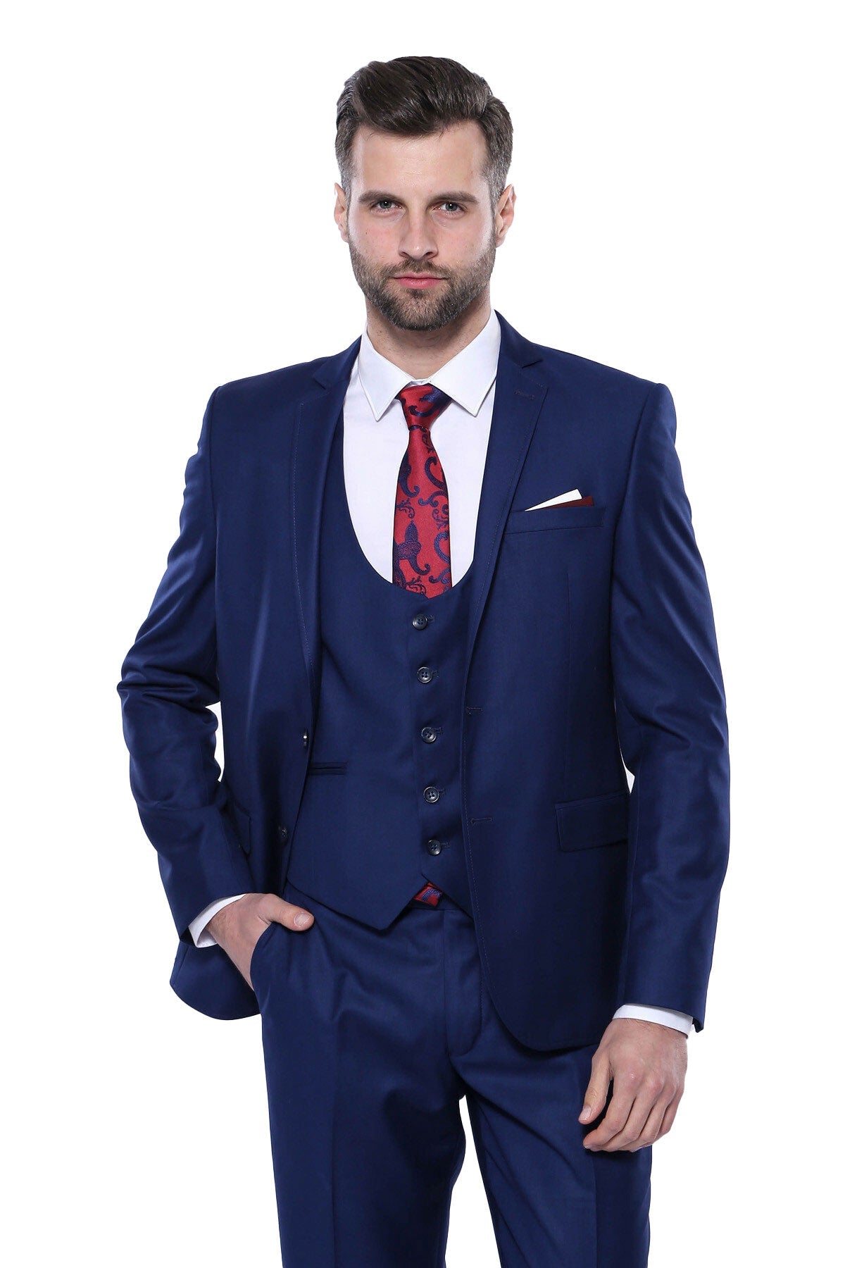 Elevate your formal attire with this Navy Blue Slim Fit Men's Suit with Vest from Wessi. Combining both style and comfort, this suit is tailored to fit your body perfectly and comes with a complementary vest for a polished look. Upgrade your wardrobe and exude sophistication with this must-have suit.